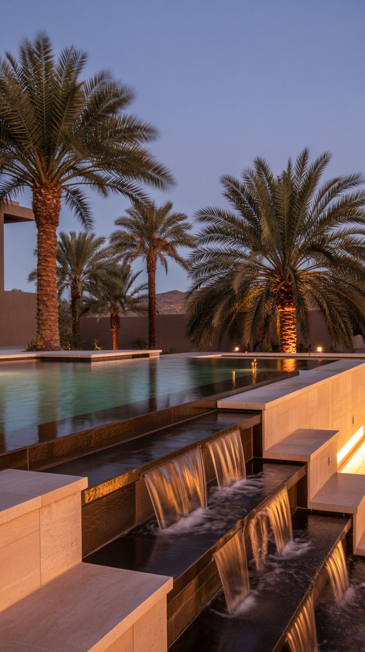 You can always pull off a grotesque idea like a wide tiered pool with big palm trees towering from all angles. A good light work for the pool area will seal the deal like this one.