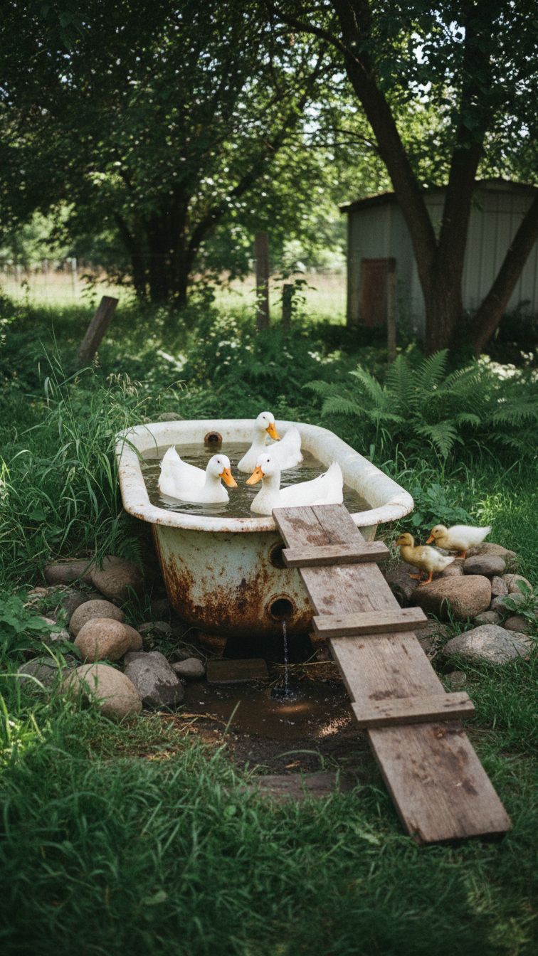 The good thing about ducks is that they don’t care about how the pond looks. As long as they can have their bath, they’re ok. You can use a rusty bathtub for this purpose.
