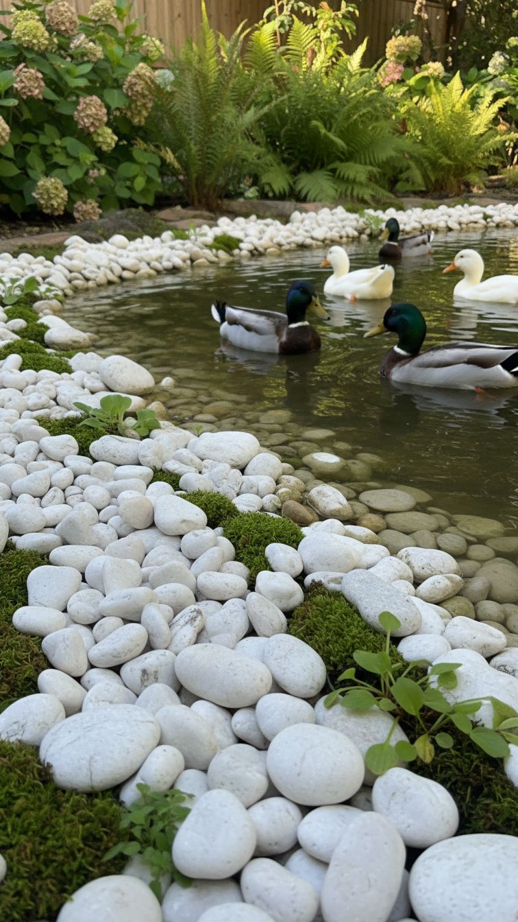 White and green are two bold colors that contrast each other creating a significant dissimilarity. If you already have a duck pond in your backyard, consider the possibility of adding the White Sea pebbles along the edge of the pond.