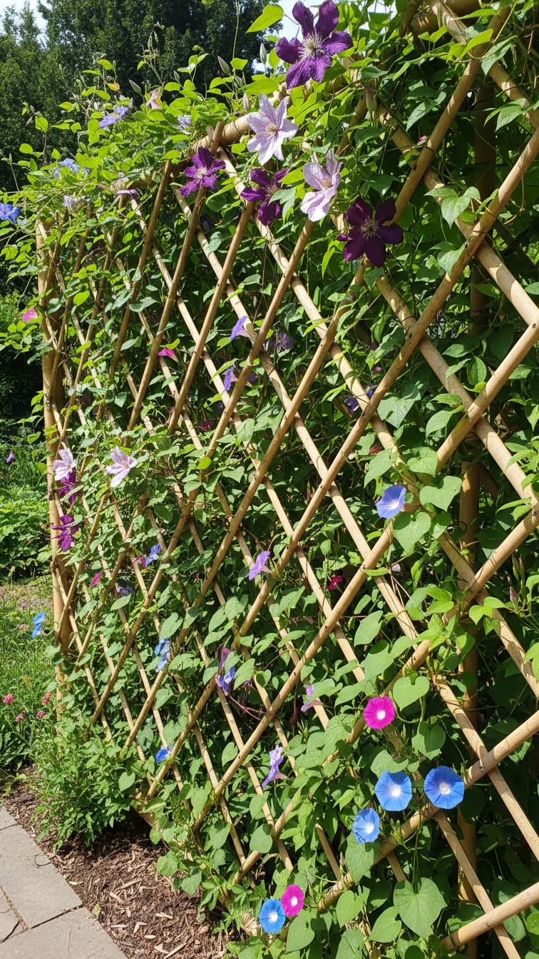 A bamboo lattice fence is perfect for adding charm and supporting climbing plants. The lattice design provides a sturdy framework for vines and flowers like clematis, wisteria, and morning glories.