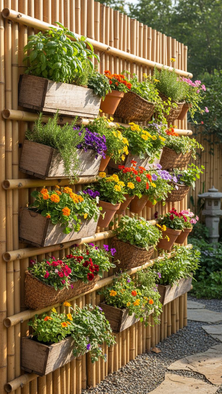Integrating planters into bamboo fences brings your garden to new heights. This setup is excellent for vertical gardening, allowing you to grow herbs, flowers, or even small vegetables in a space-saving way.