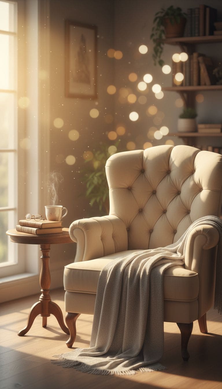 Set up a cozy reading nook in one corner of your living room. All you need is a comfy chair, a soft lamp, and maybe a pile of your favorite books stacked within easy reach.