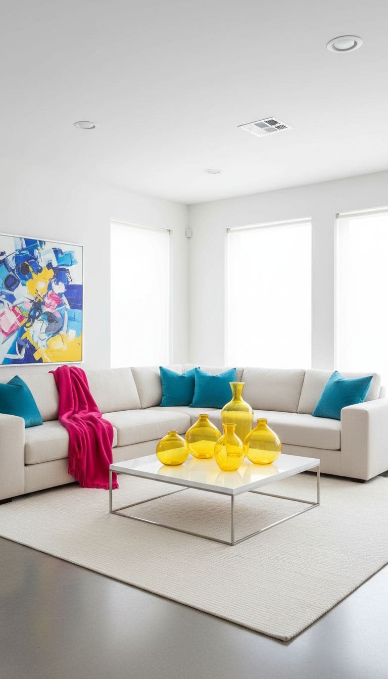 Brighten up your living room with colorful accents. Toss in some vibrant pillows, drape a multi-hued throw over your sofa, or display bright vases on the shelf.