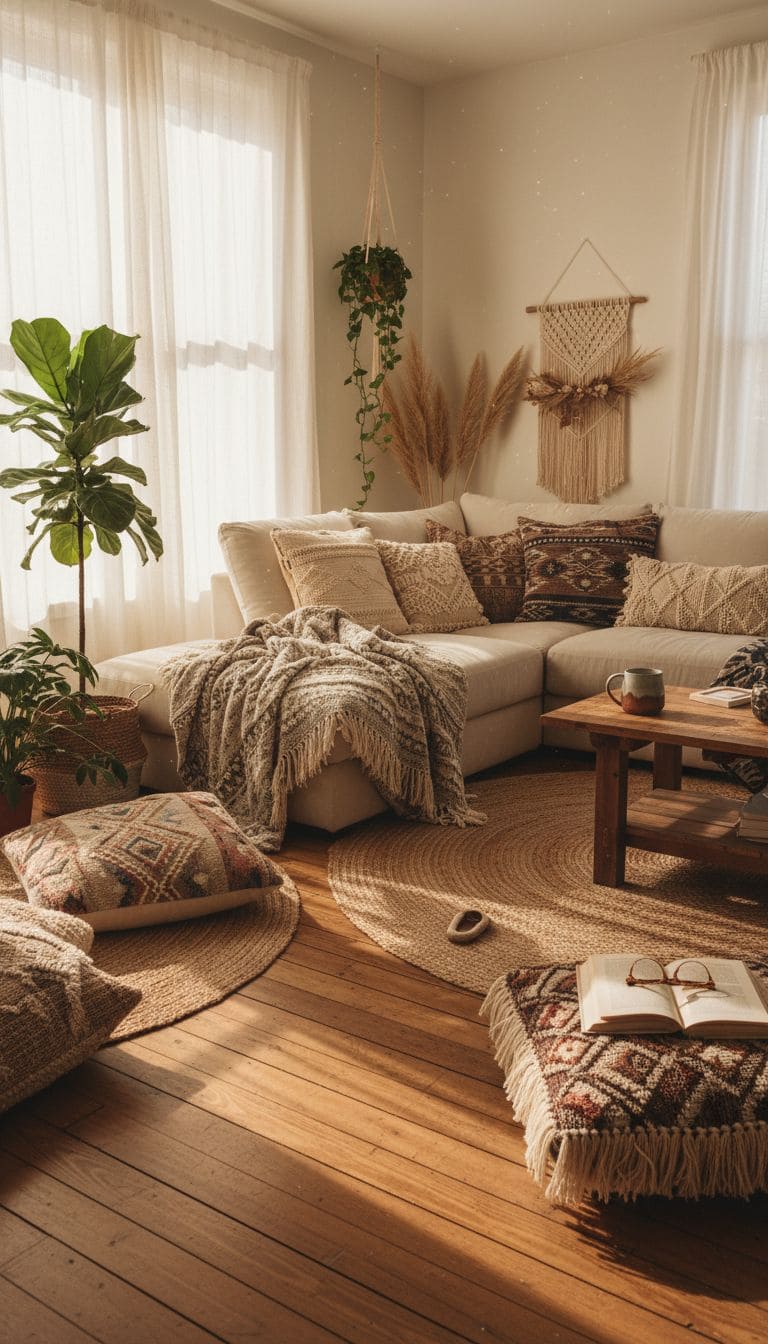 Boho is the king of cozy. It’s about creating a space where comfort meets chic, where every seating option invites you to stay a while. Soft throws, plush pillows, and candles that smell like heaven all add up to a living room that’s not just seen but felt.