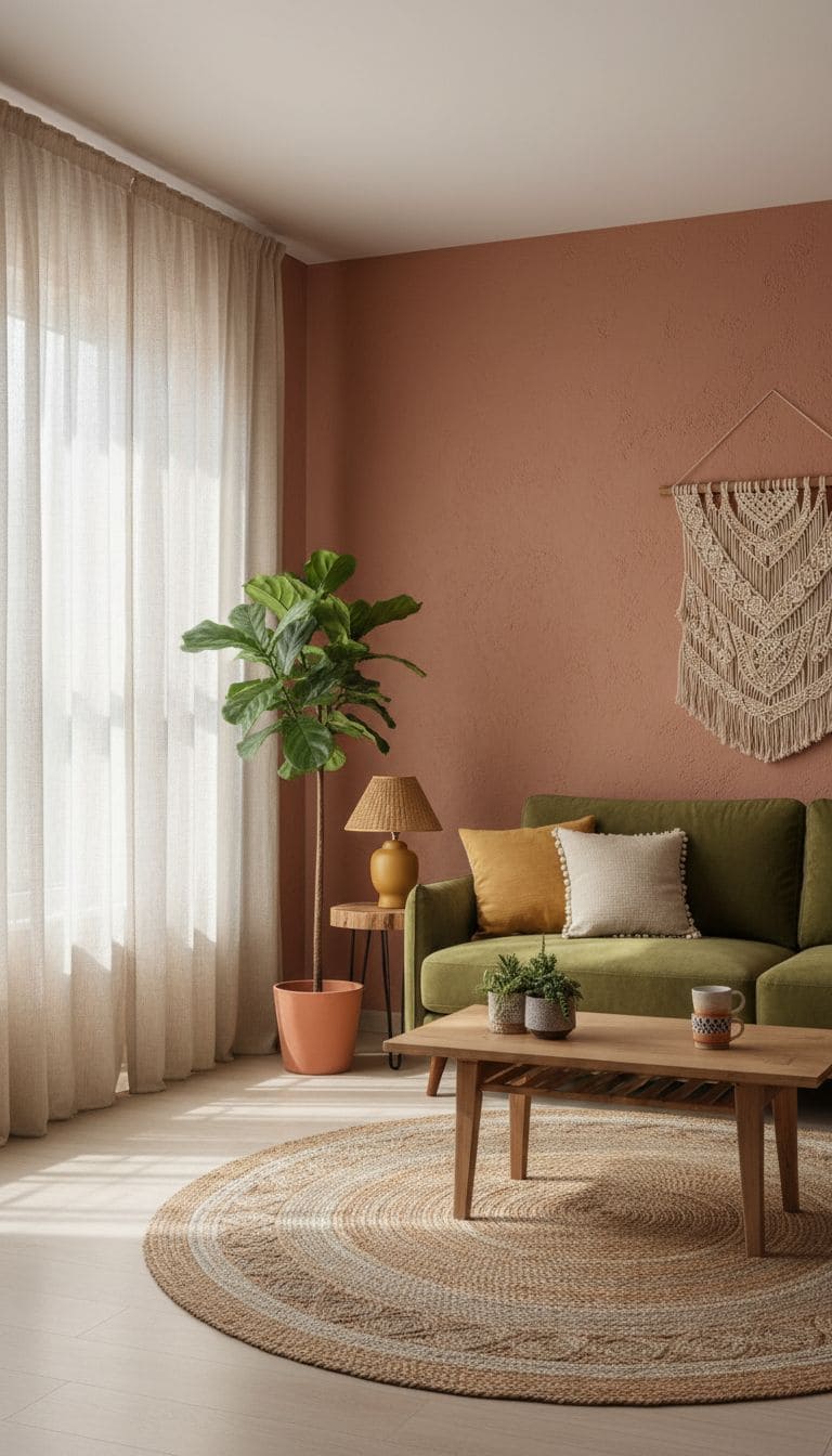 An earthy color palette is your go-to for that grounded, back-to-nature feel. Utilize shades like terracotta, olive green, and mustard yellow to warm up your space.