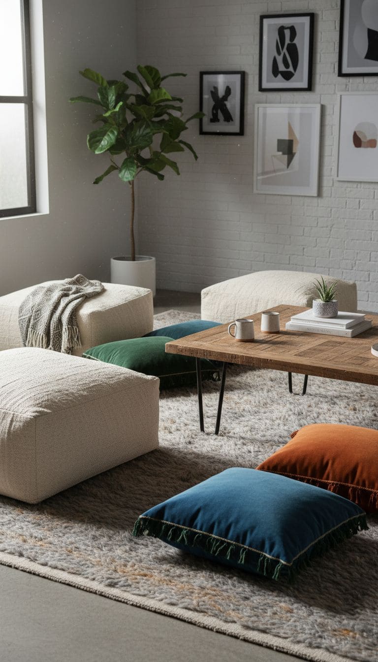 Get down to earth with low seating arrangements. Think floor cushions, poufs, and maybe a low slung sofa.