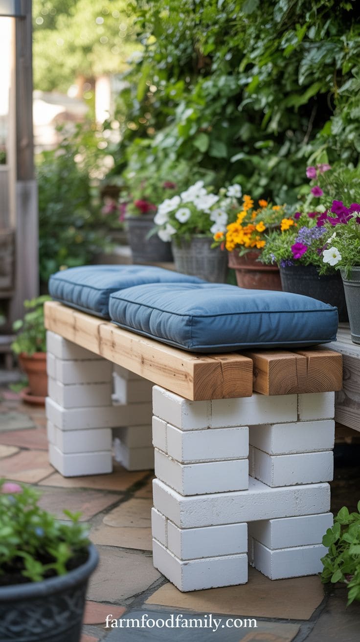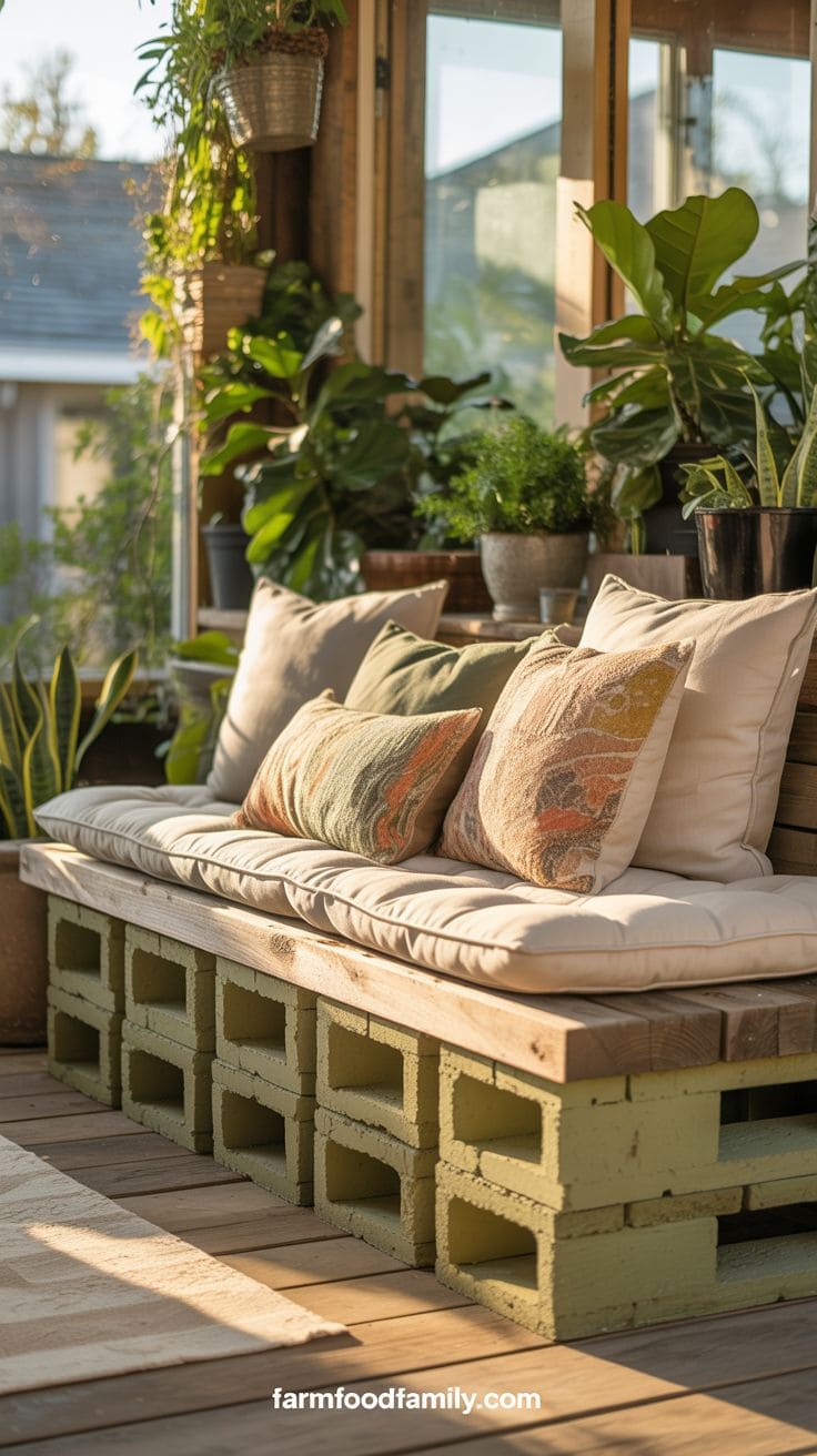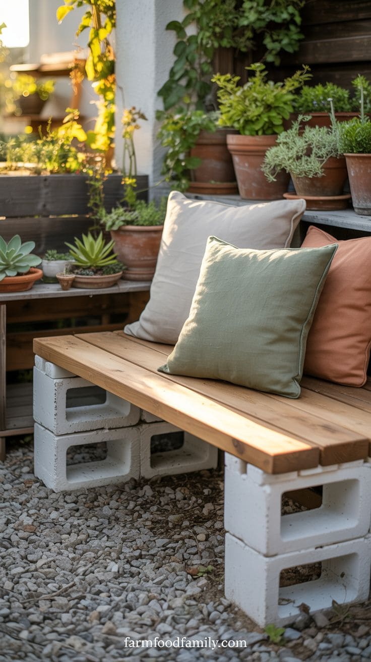 If you find that your cinder block bench is too plain, you can use cushions to accessorize it further. Standard living room cushion also work well for cinder block benches.