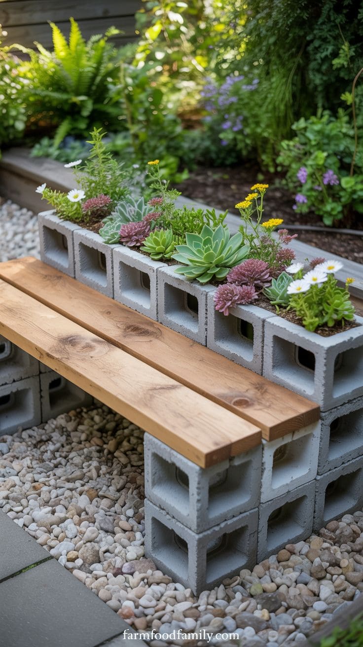 In this one, you can go for the old school no-hole cinder block connected together to form a concrete block bench. All you have to do is to stack the blocks together using construction adhesive.