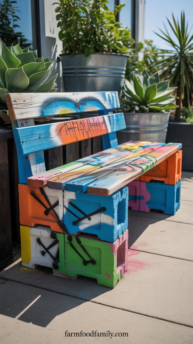 This outdoor graffiti cinder block bench was assembled using 2 two-holed cinder blocks where two 2×2 wood stained lumber will rest and 6 three-holed cinder blocks to act as bench feet.