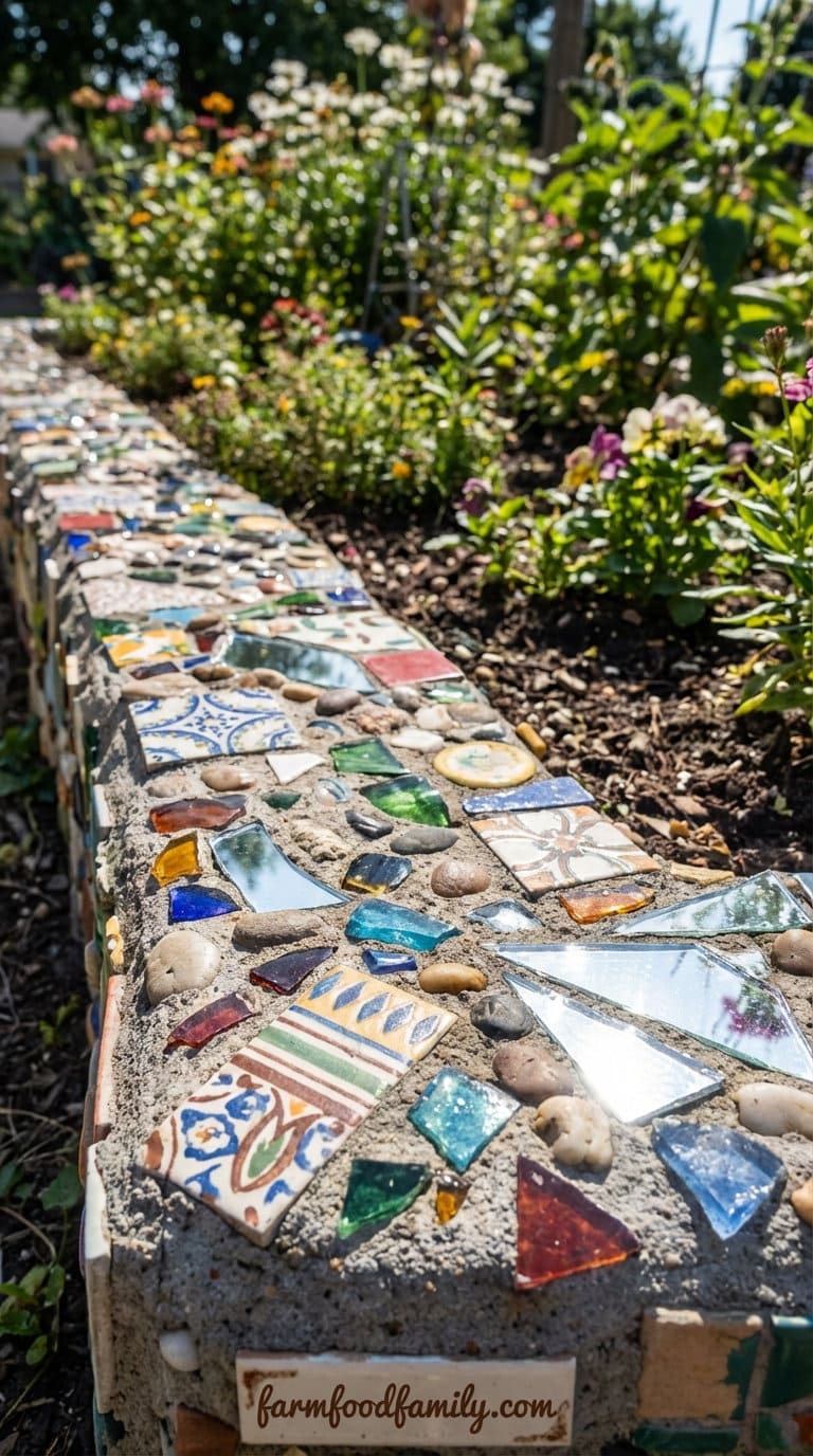 Get creative with mosaic concrete edging by incorporating tiles or glass pieces. It creates colorful, artistic borders that are sure to catch the eye. Each piece is like a splash of paint, turning your garden edges into a masterpiece.