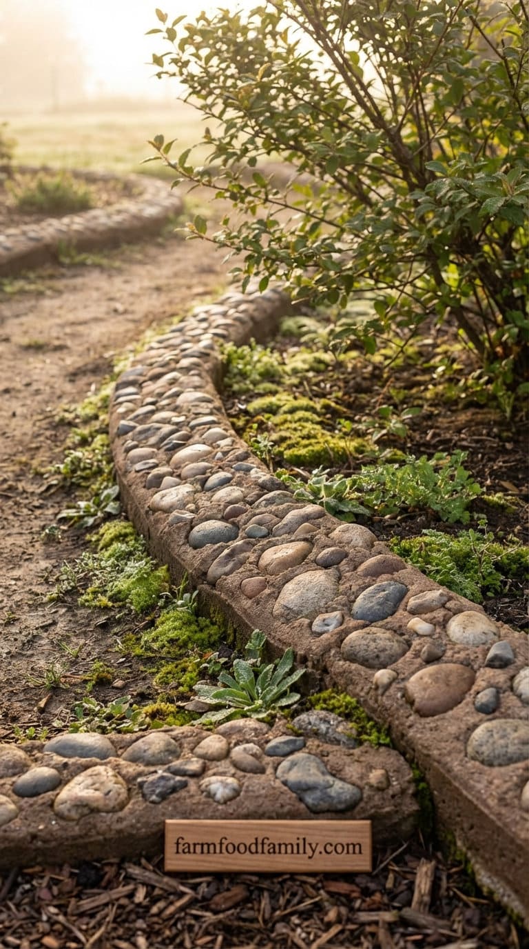 Embedded stone edging features concrete mixed with stones for a unique, textured look. It adds a natural element to pathways and garden borders, almost like your path has a story to tell.
