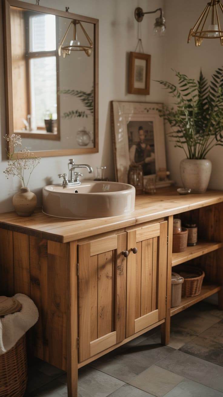 Wooden vanity units offer a rustic touch that warms up the bathroom. They bring a natural, sturdy feel that’s hard to beat.