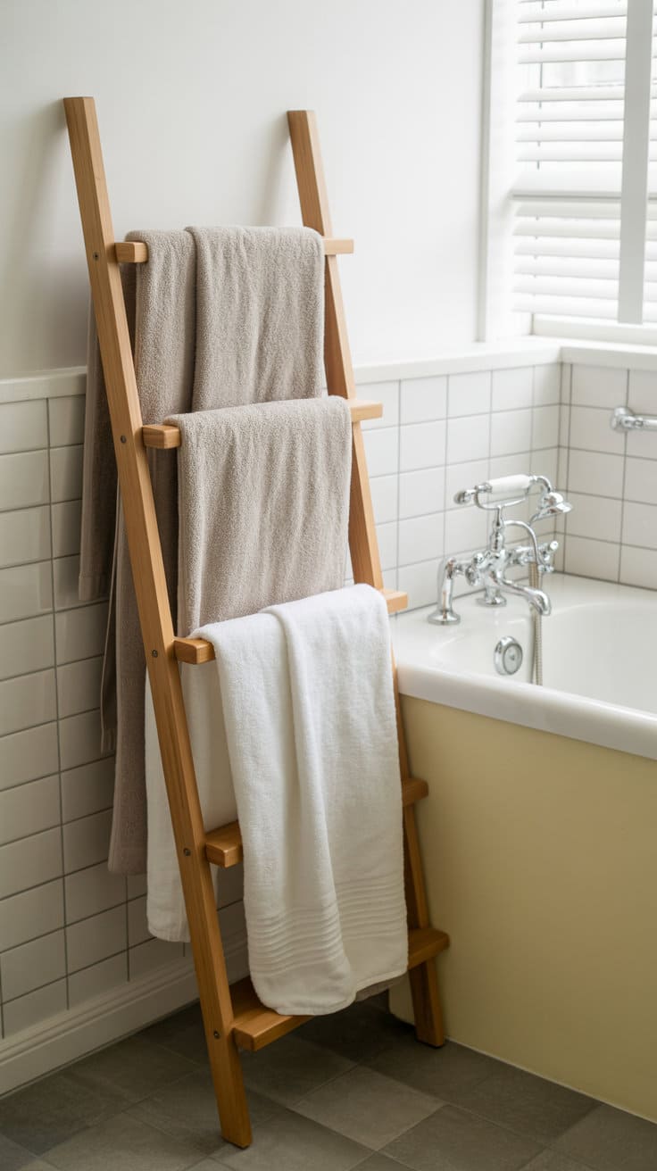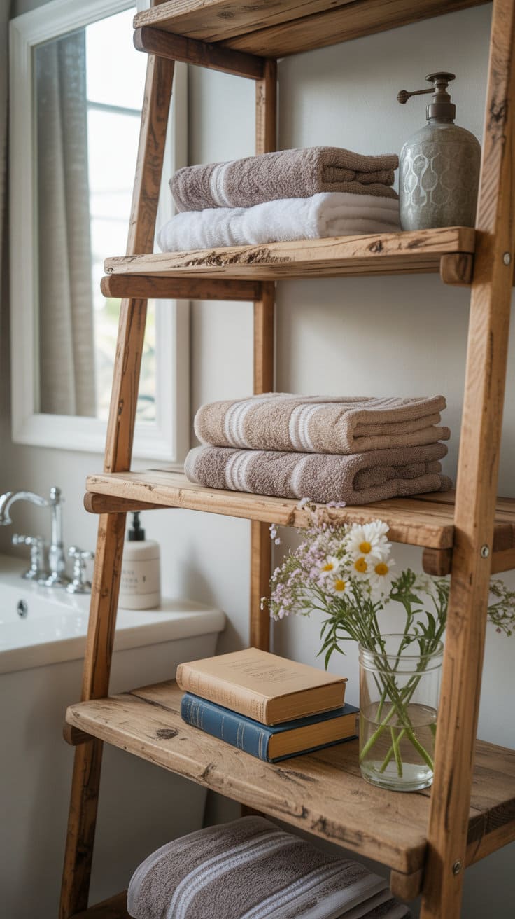 Think about what you’ll display. This isn’t just about stacking towels. Add some old books, a vase of wildflowers, or some quaint ceramic pieces. Place these shelves over the toilet or by the sink where they can be both functional and decorative.