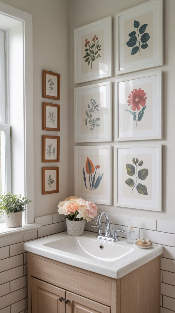 Selecting the right pieces can brighten up your space significantly. Hang a large floral print as the centerpiece or create a gallery wall with smaller botanical prints. Position them where they can be admired without suffering from moisture damage.