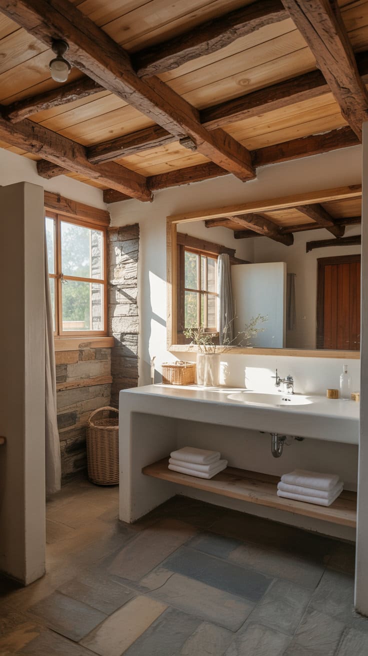 Wooden beams and exposed ceilings add a structural beauty that harks back to old-world craftsmanship. They bring a robust, earthy feel to the bathroom.