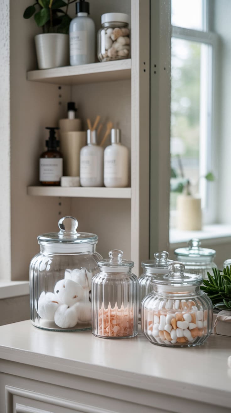 Use these jars to store necessities like cotton balls, swabs, and bath salts. Arrange them on open shelves or your vanity to enhance the decor while keeping essentials handy. Choose styles that match your bathroom’s color scheme to maintain a cohesive look.