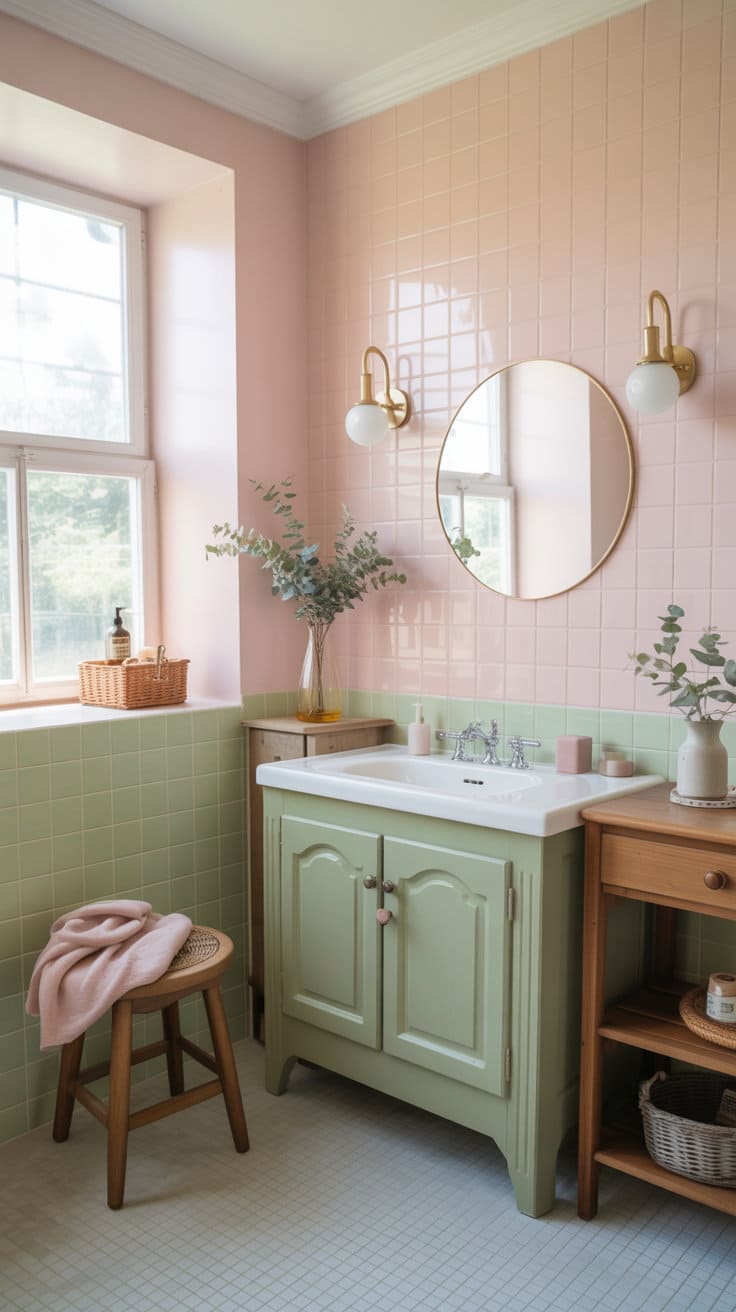 Pastel color palette softens the room with its gentle hues, turning any bathroom into a soothing escape.