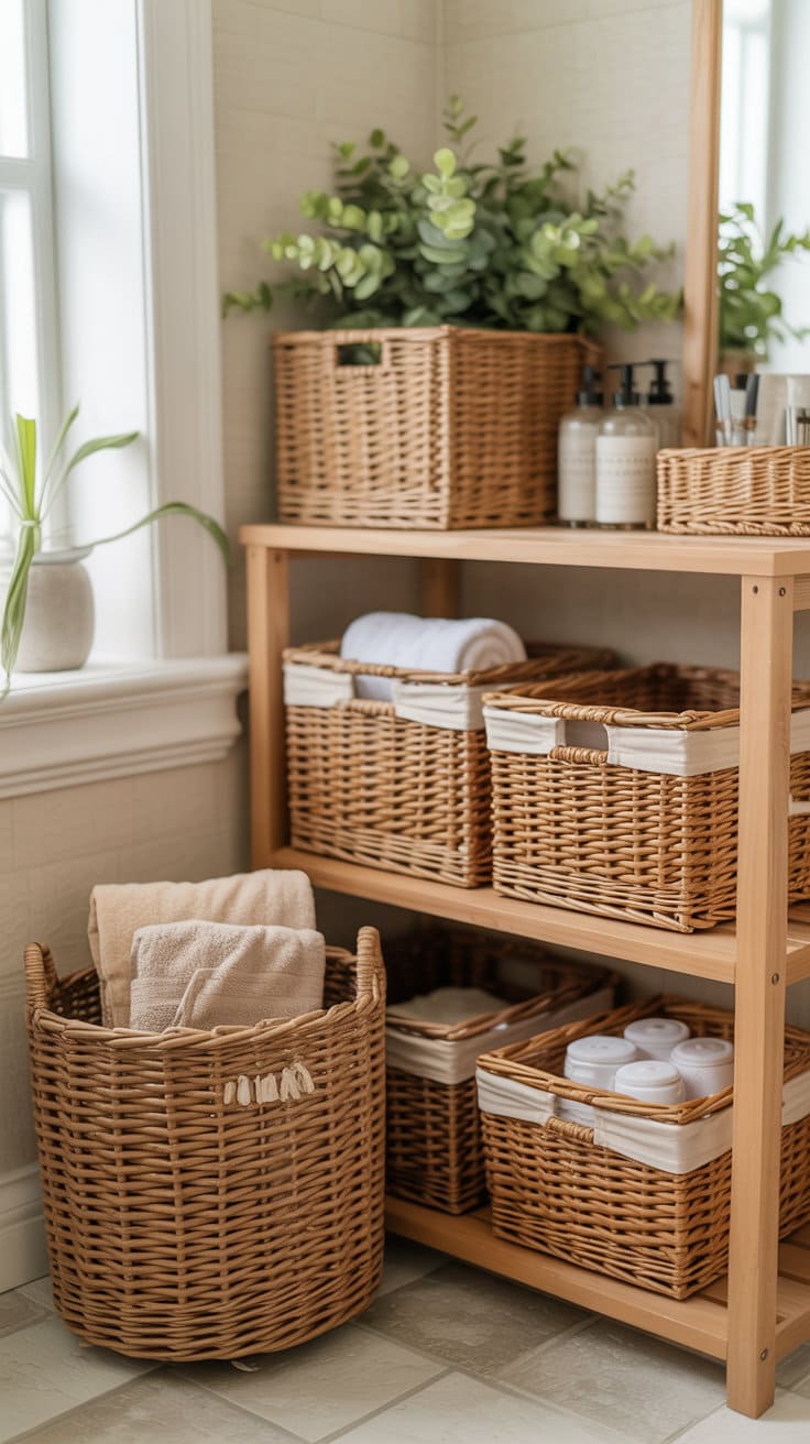 Choose baskets of various sizes for different needs—larger ones for towels, smaller ones for toiletries. They’re not just storage; they’re decor too.