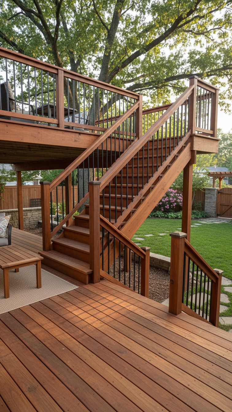 You can go with the traditional wood stair deck skirting. You can give the deck an angled and elevated glamour. Surround it with wood and metal railing and you are all set.