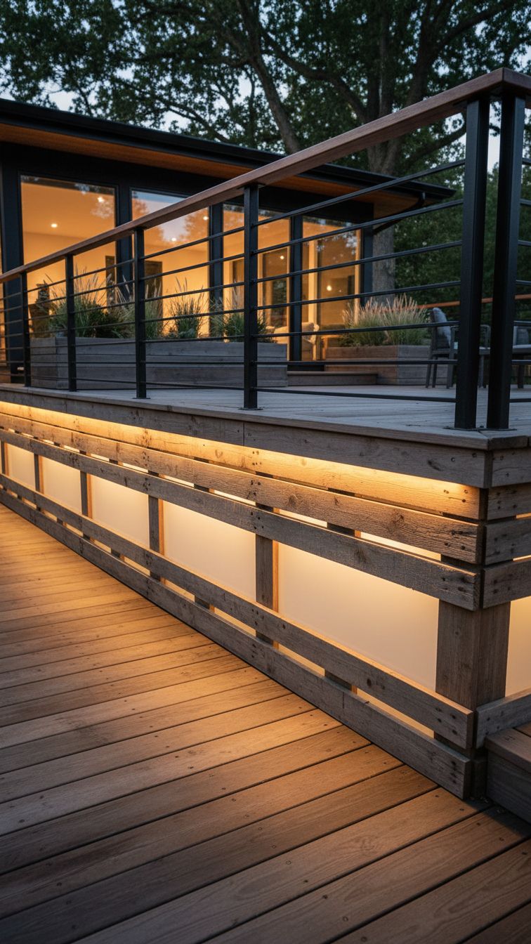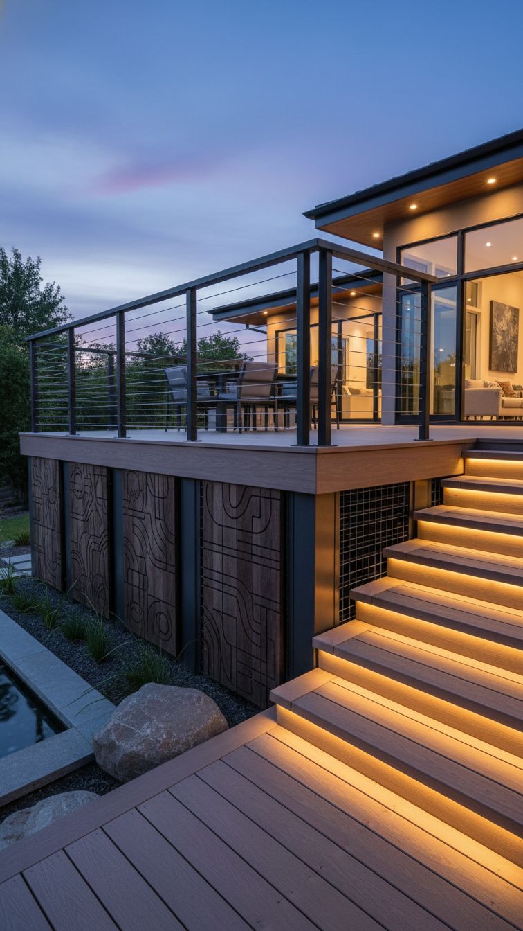 And if you want to go beyond horizontal deck skirting and pursue a more decorative skirting, check out this ornate engraving in the skirt panels of this idea. The railings are made of metal and industrial wire and the wooden stairs are brightened by LED step lights.