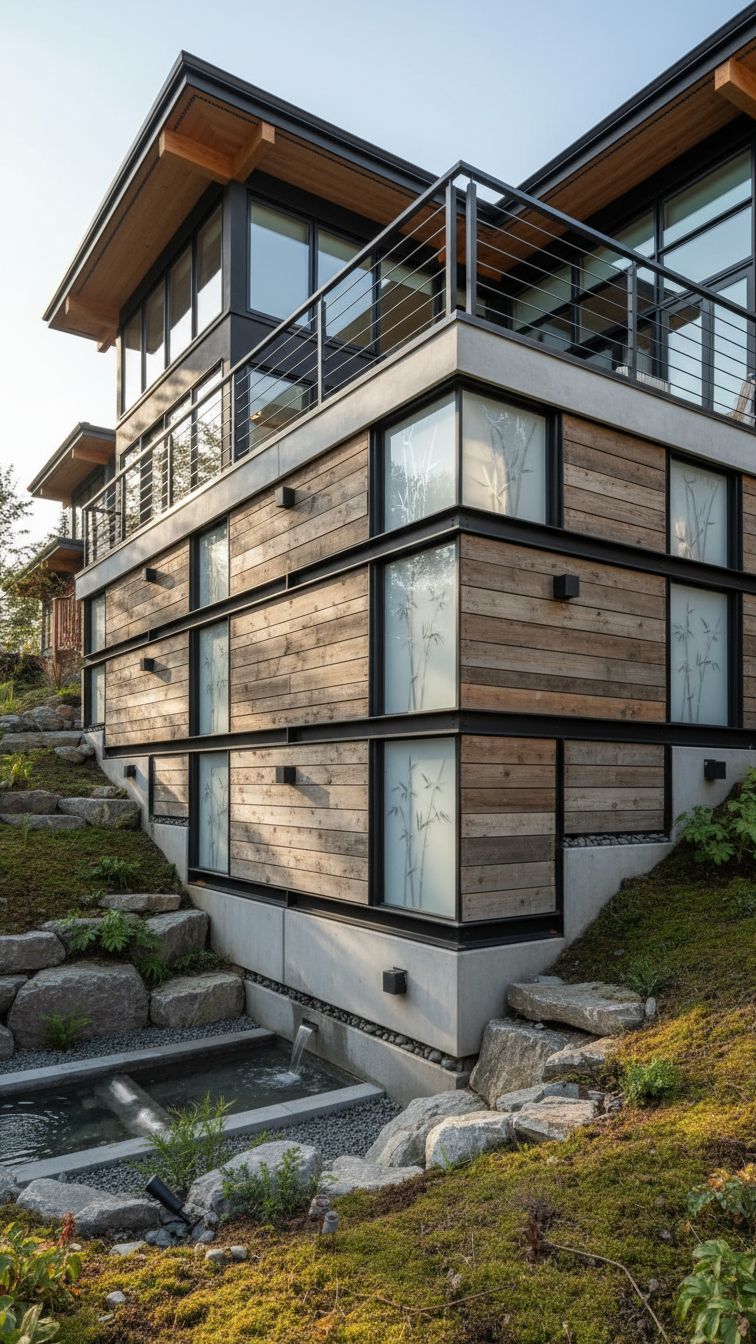 And if you have the budget for a large estate, never be afraid to mix and match components so that the focus would veer away from the sloped terrain. Use the unevenness of your ground to an aesthetic advantage like this one.