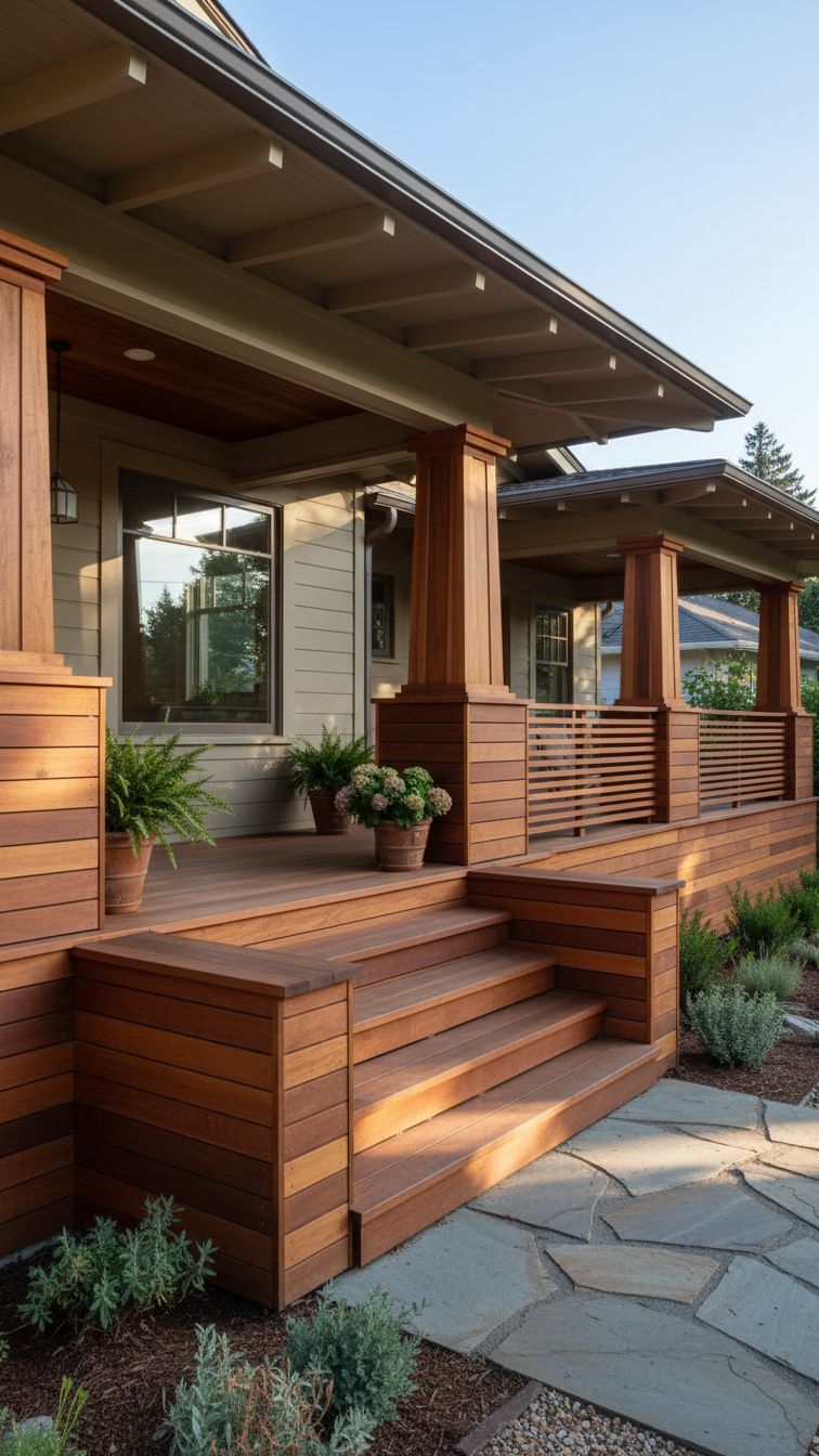 Speaking of true Craftsman style, this deck skirting in the front porch features stained wood pallets on a horizontal design. It used one color tone for the pillars, the stairs, and railings. The contrast of beige to mahogany brown is just stellar.