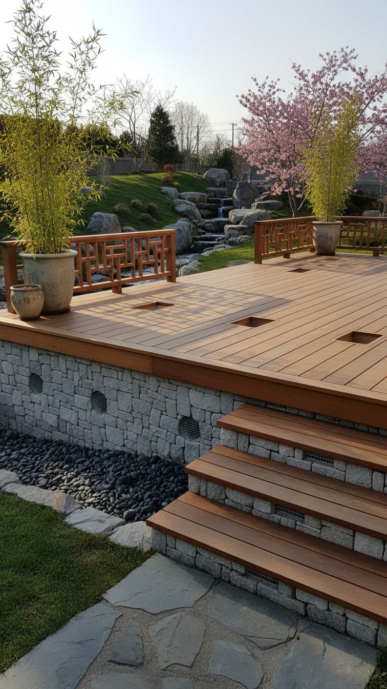 This one here features a wood finish, free-standing deck. The skirt is made of gray-white cobble stone and extended to a side stair. It has very small boxes to trap unwanted small animals. Overall, it brings an Asian flair to the floating deck.