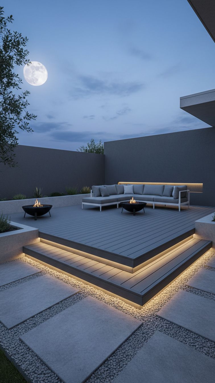 This one is totally a floating deck with just floating deck skirts that serve as a two-step stair for the whole deck. Instead of railings, the deck is accented with bright LED lights to make a warm contrast with the grey monochrome color of the deck.