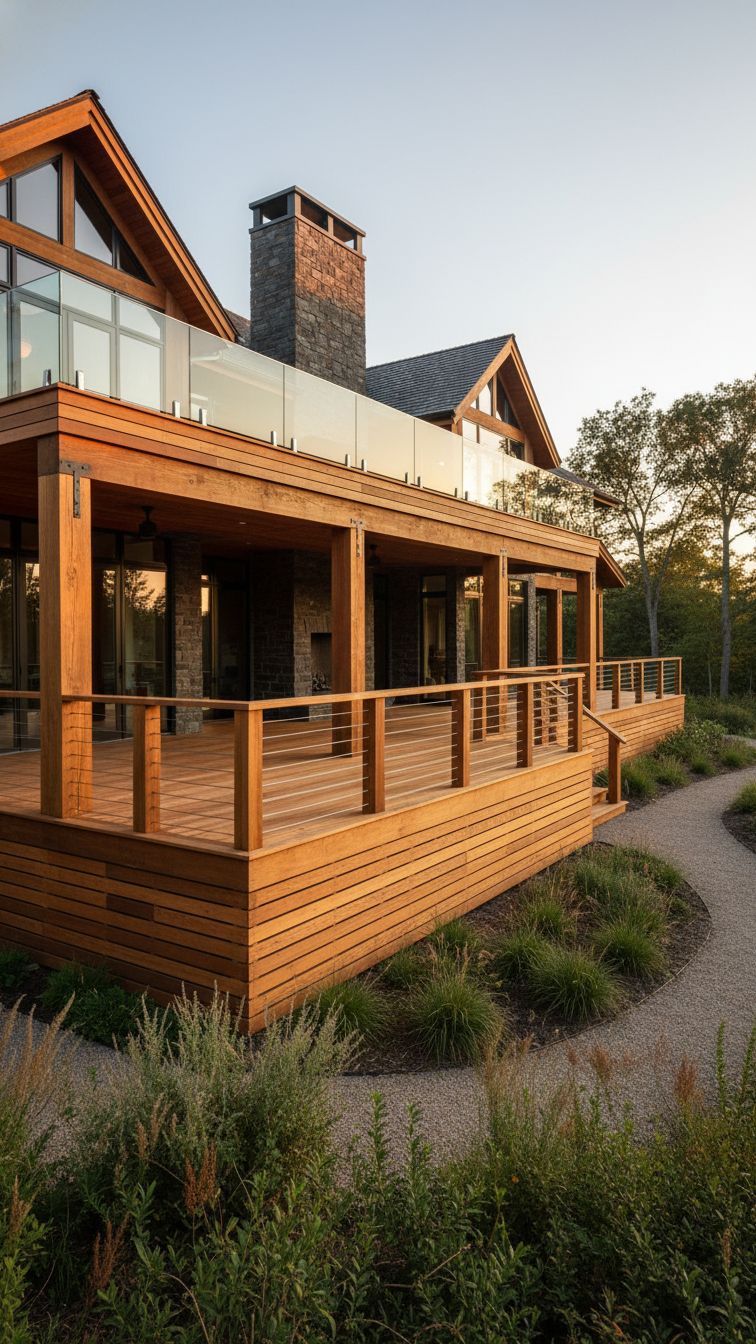 This modern rustic home in a large estate features a standout cedar deck of slatted design. The strong, warm hue of the cedar wood makes it breathtaking and the inclusion of fiberglass enclosure and wood posts. There is nothing more posh than this vibe.
