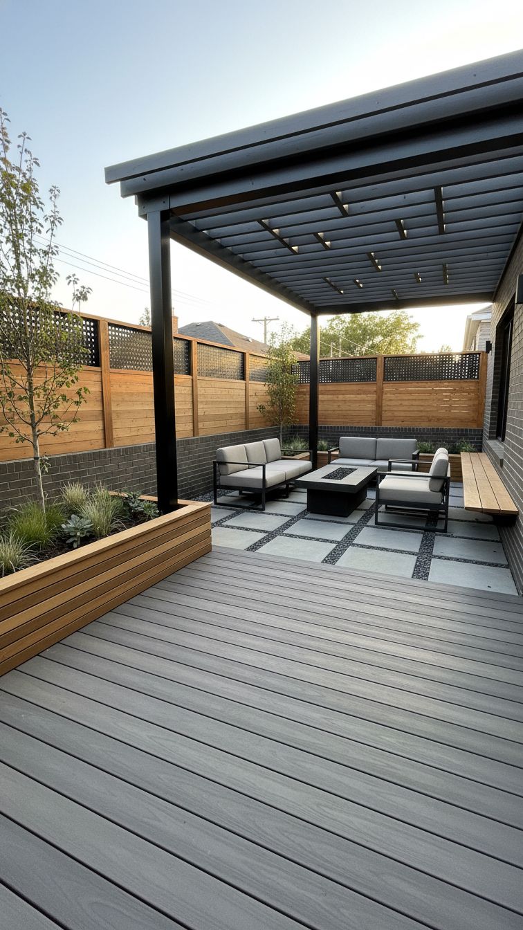 This first idea here incorporated an array of construction elements but the horizontal deck skirting that it incorporated jugged them all in a cohesive, clean look. The interplay of brick stones, wood, and metal in a well-arranged back patio with pergola is stunning.