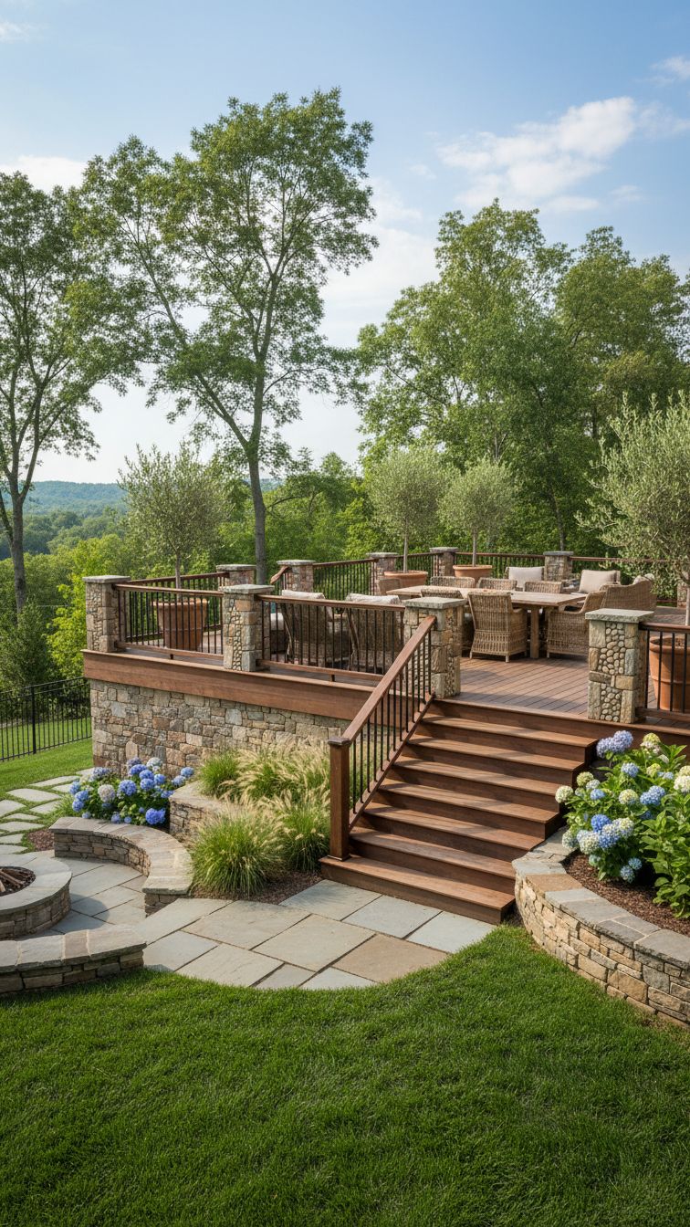 This backyard patio deck owes it solid and upscale appeal from its stone deck base, railing, and hardwood stairs. The balance of elements to this look also give it a seamless look but the stone deck really gives it a natural vibe.