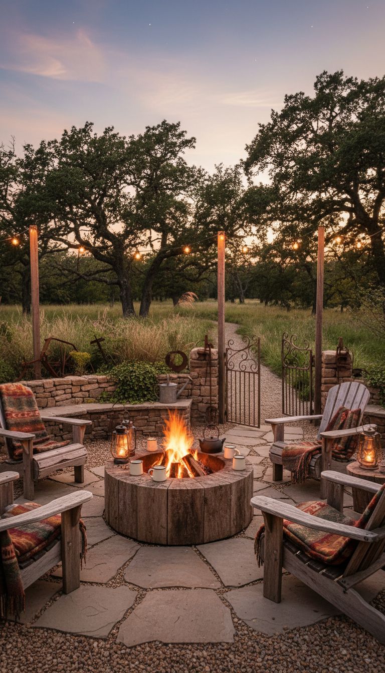 Keep things cozy with outdoor throws and maybe a fire pit. It’s all about making a comfy spot where you can unwind and feel a bit country.