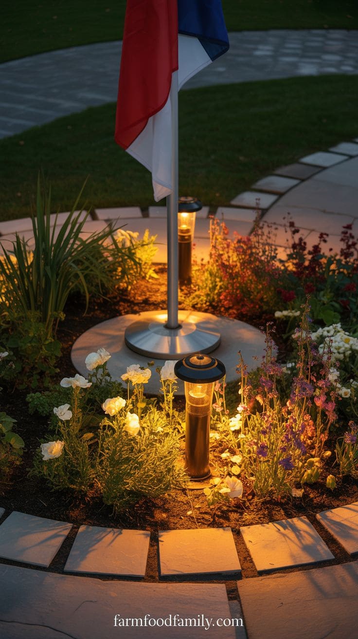 Options like solar lights or LED fixtures can spotlight the flag and your beautiful garden work.