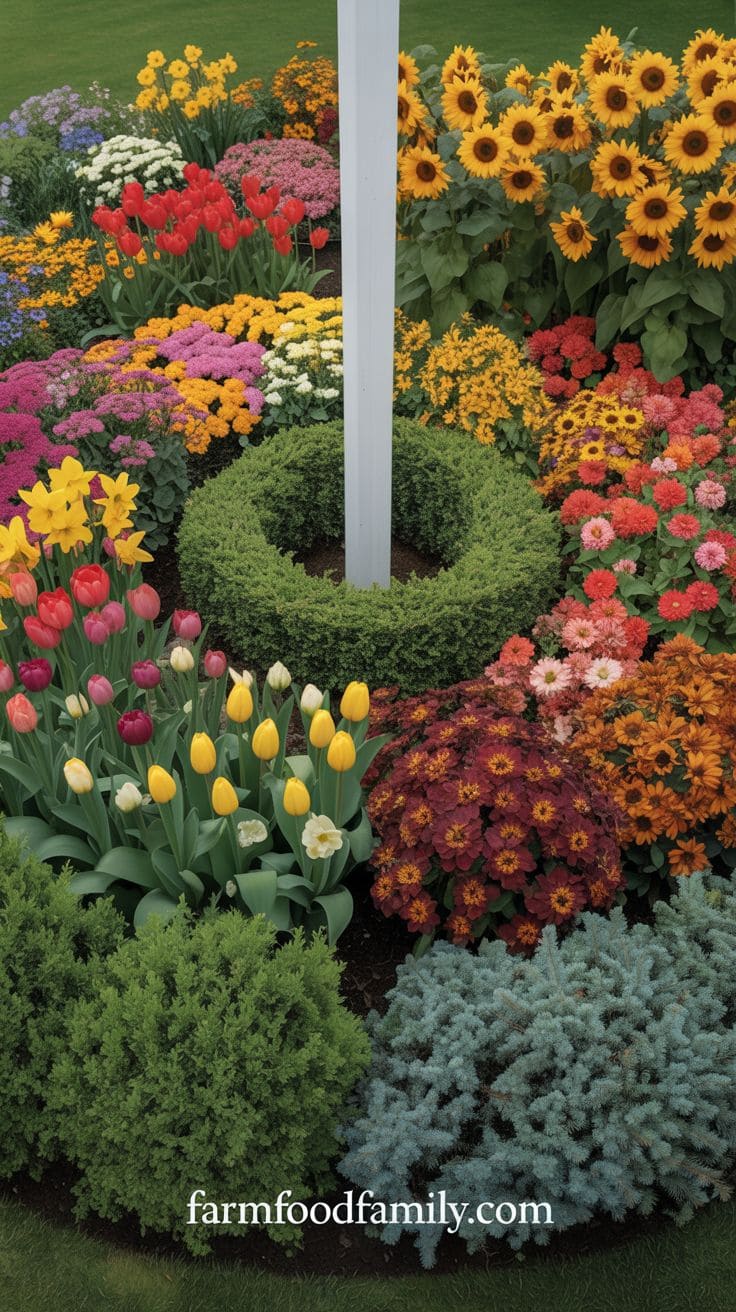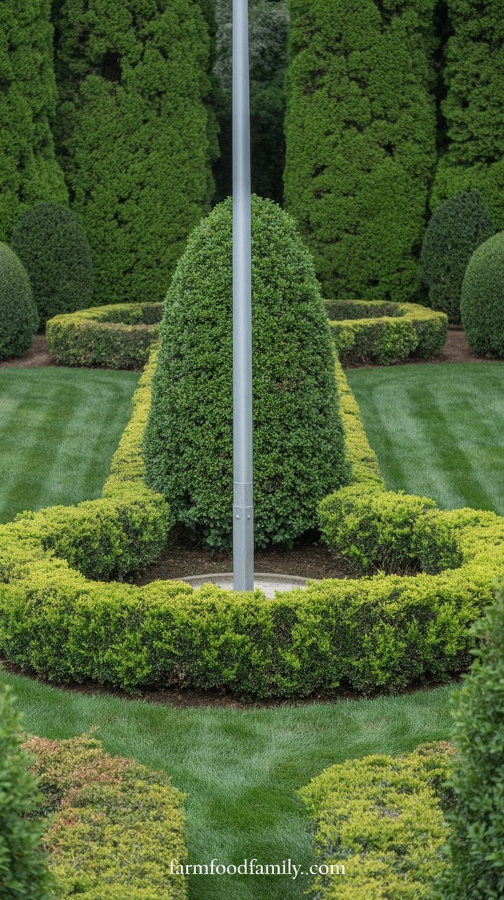 Choose bushes that stay green all year round, like boxwoods or yews, so even in winter your flagpole won’t look lonely.