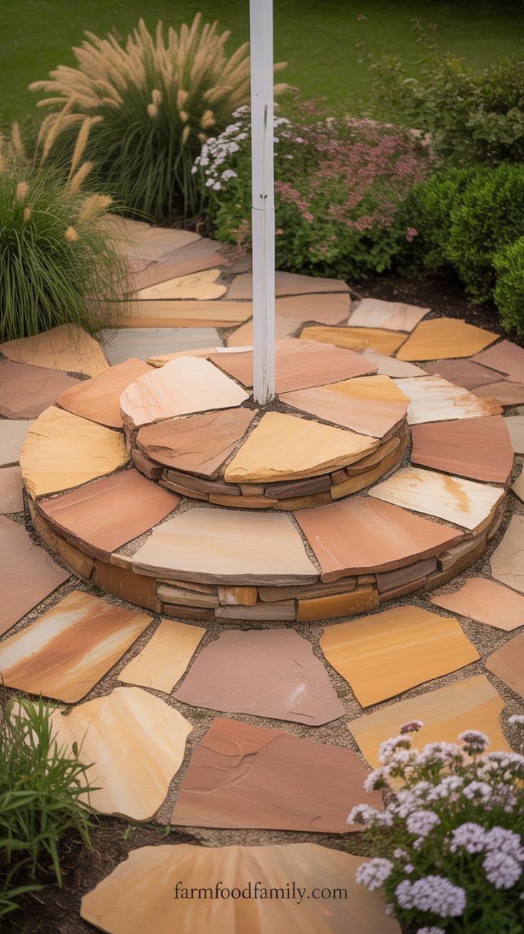 Pop some complementary plants like ornamental grasses or low-growing flowers around the edges to soften the stone’s hard lines. It’s not just pretty; it’s practical too, giving you a solid place to stand when you raise the flag.