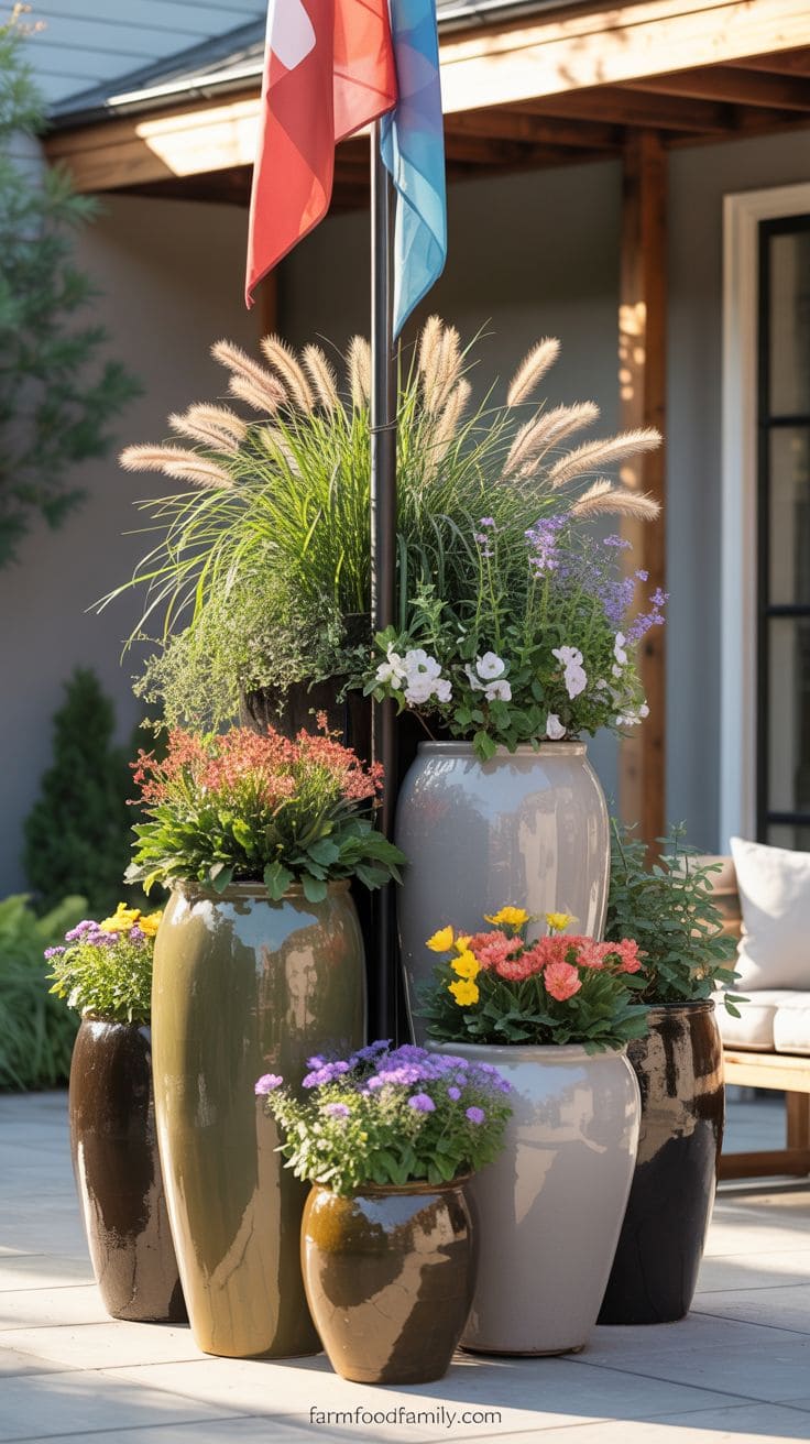 Stuff them with plants that catch the eye and thrive outdoors. Line them up around your flagpole to create a neat, attractive display.