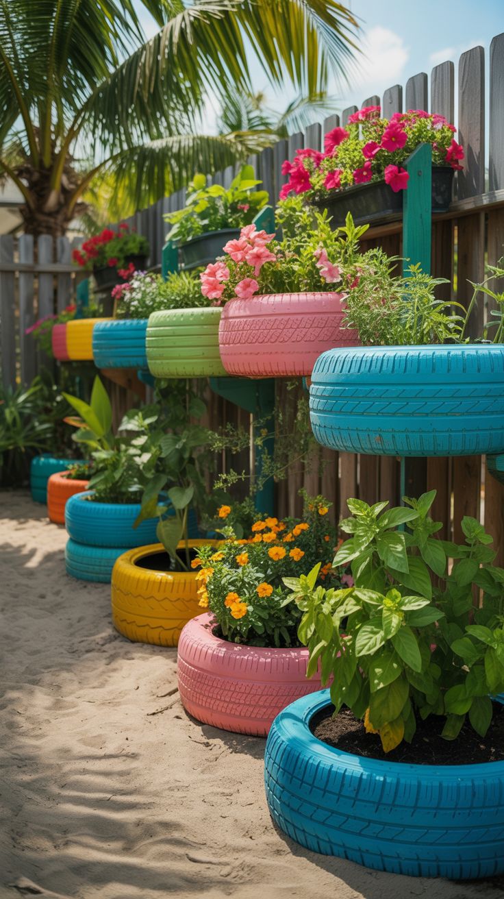 Discard the traditional flower pots and garden planters and take those old car tires in your garage, paint them to give a more colorful look, fill them with soil and use them to plant your flowers or kitchen spices.