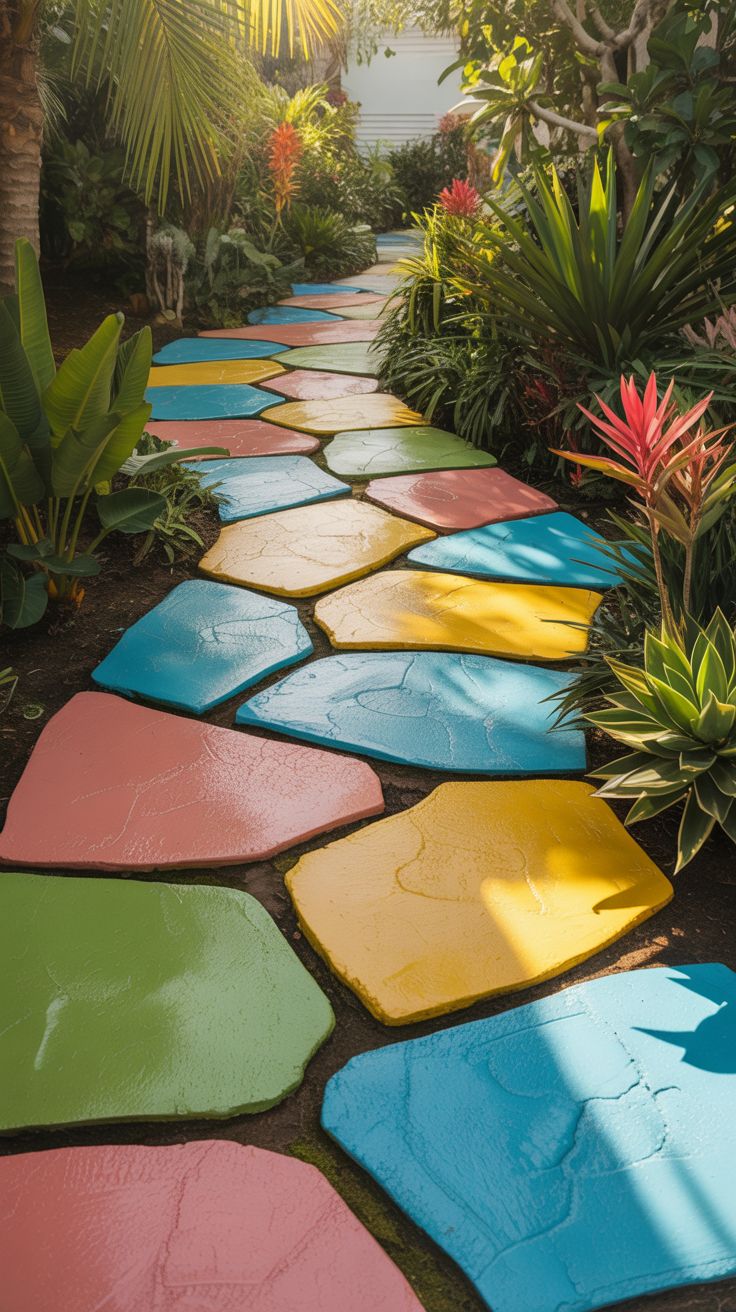 To add some bit of color to the floor of your backyard path, consider painting some of the paving tiles in different colors to give light to the plain grey color of concrete.