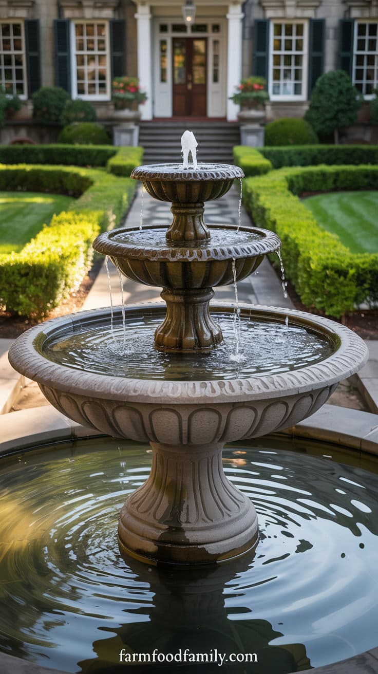 A tiered pedestal fountain exudes old-world elegance and is ideal for colonial, Mediterranean, or formal homes.