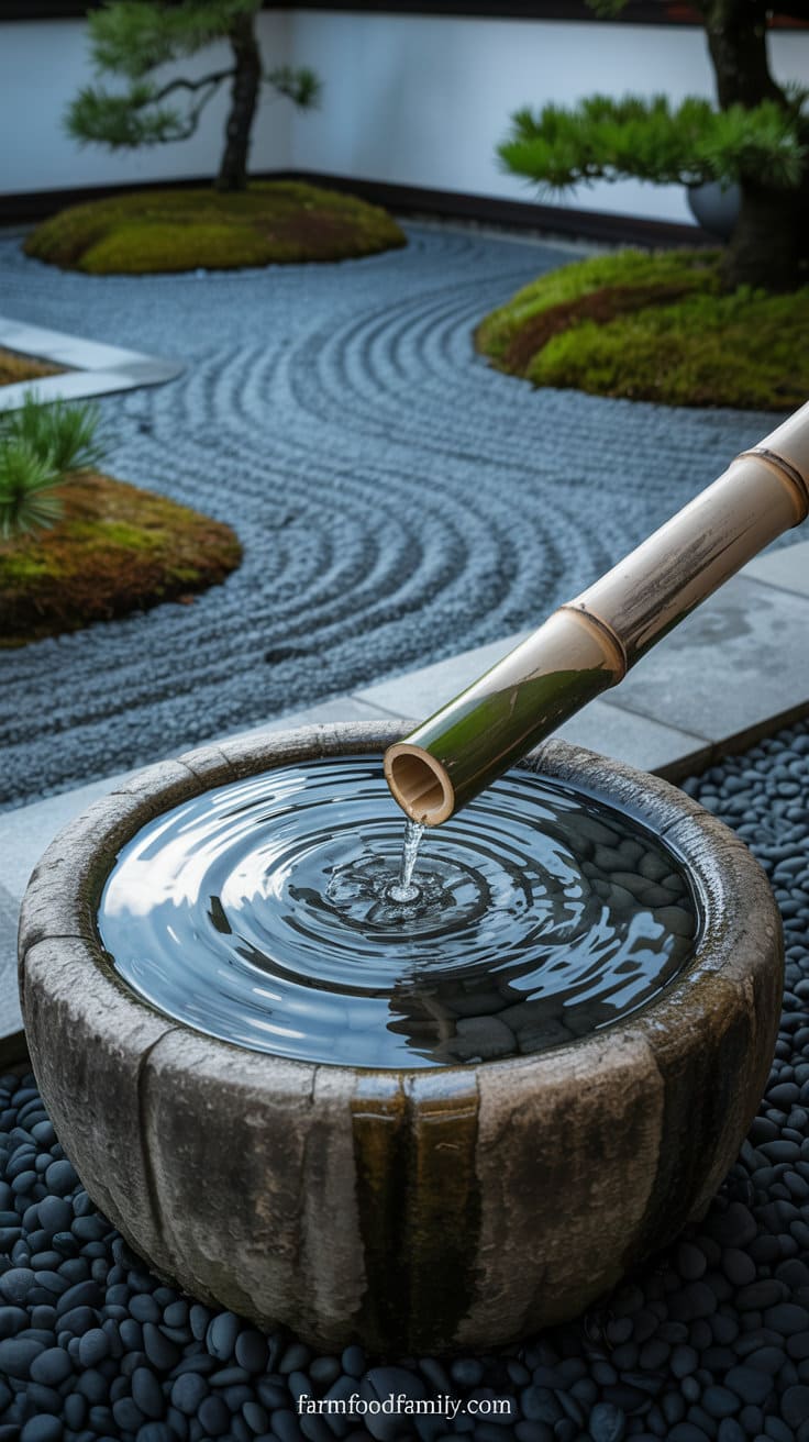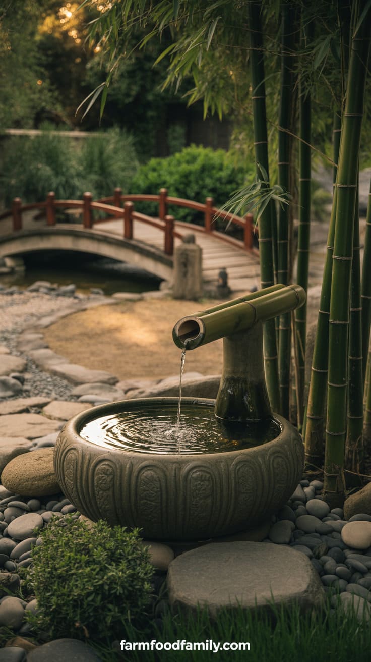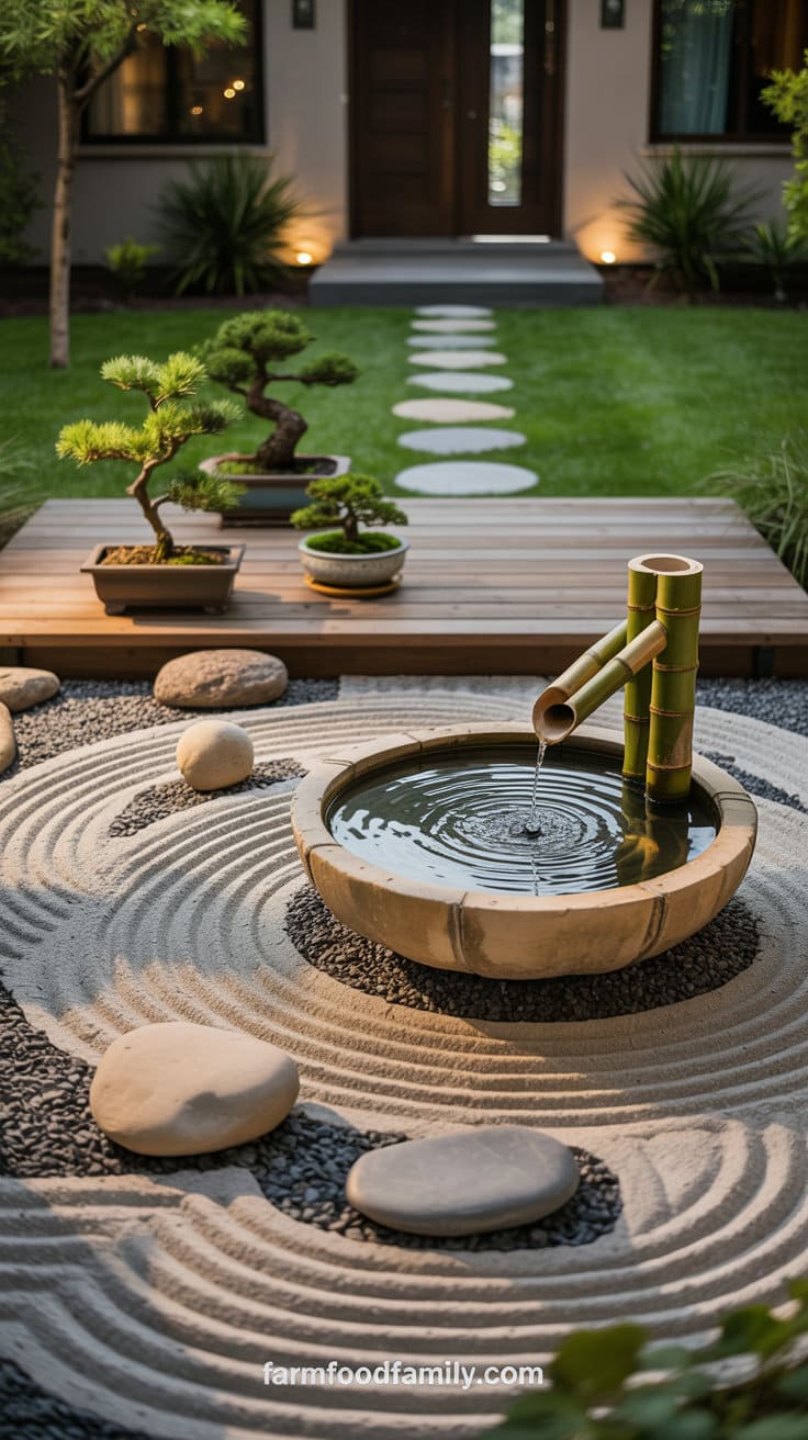 If there is enough room, you can combine it with a tiny dry stream bed or bridge. This approach works well with modern homes, Asian-inspired architecture, or minimalist landscapes where simplicity and atmosphere are important.