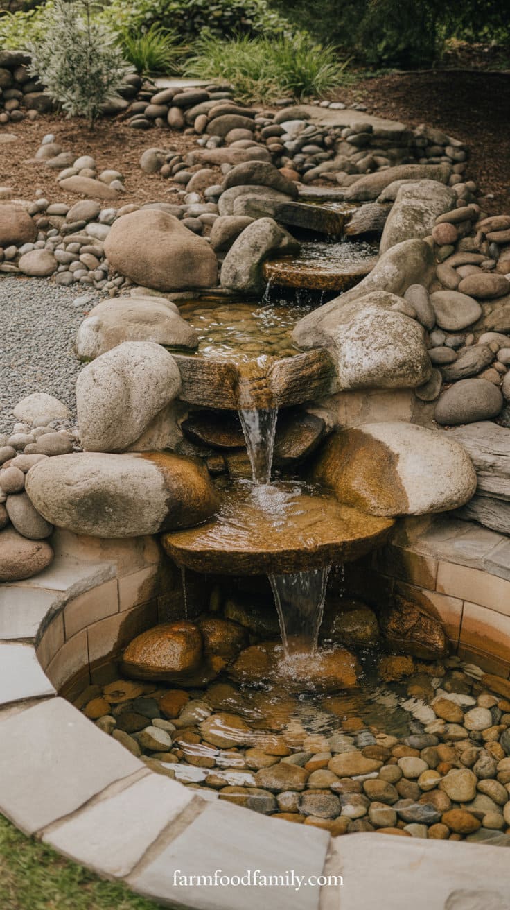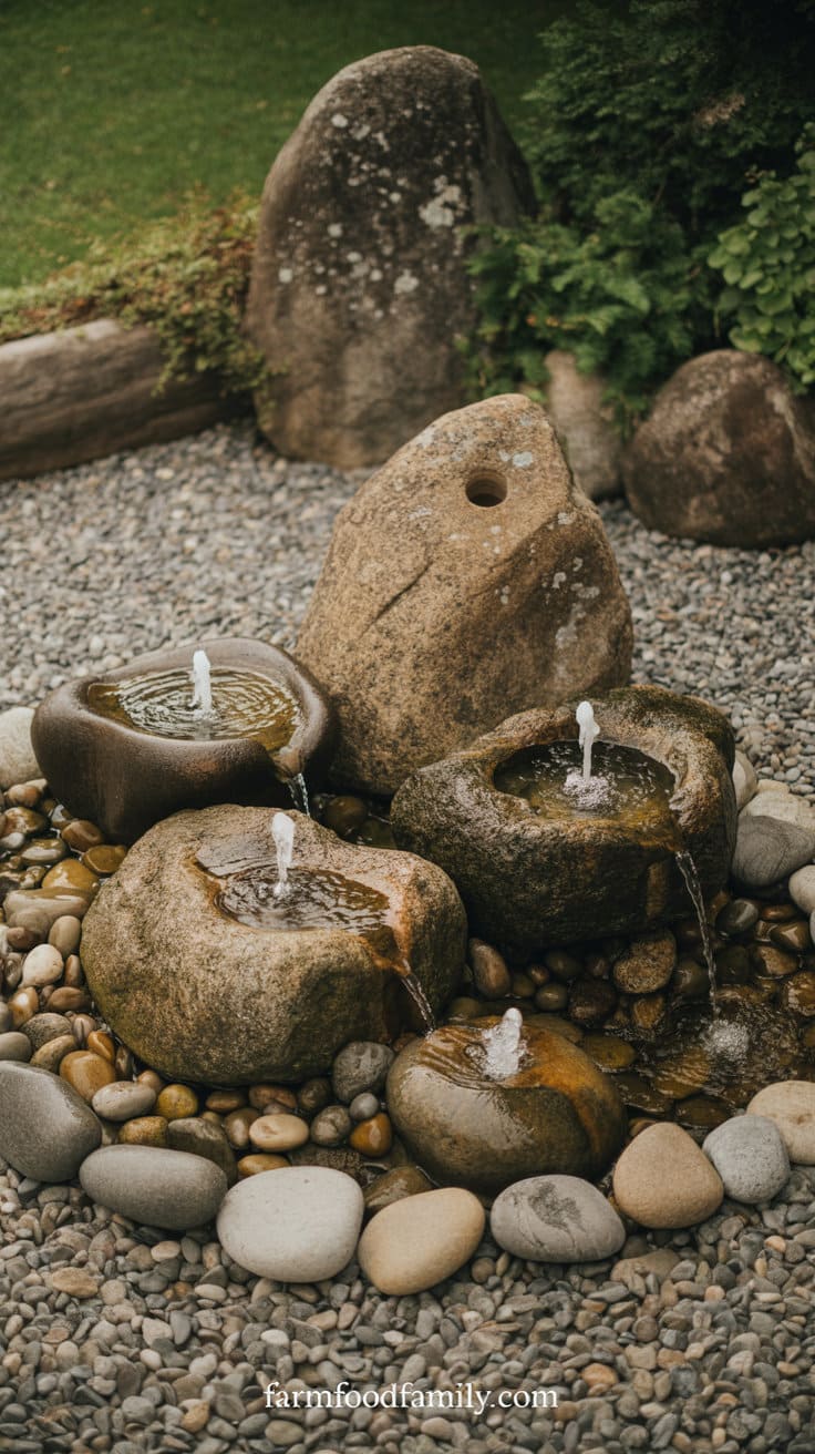 Use two or three huge natural stones with holes drilled through the middle to allow water to bubble up and flow down uneven surfaces.