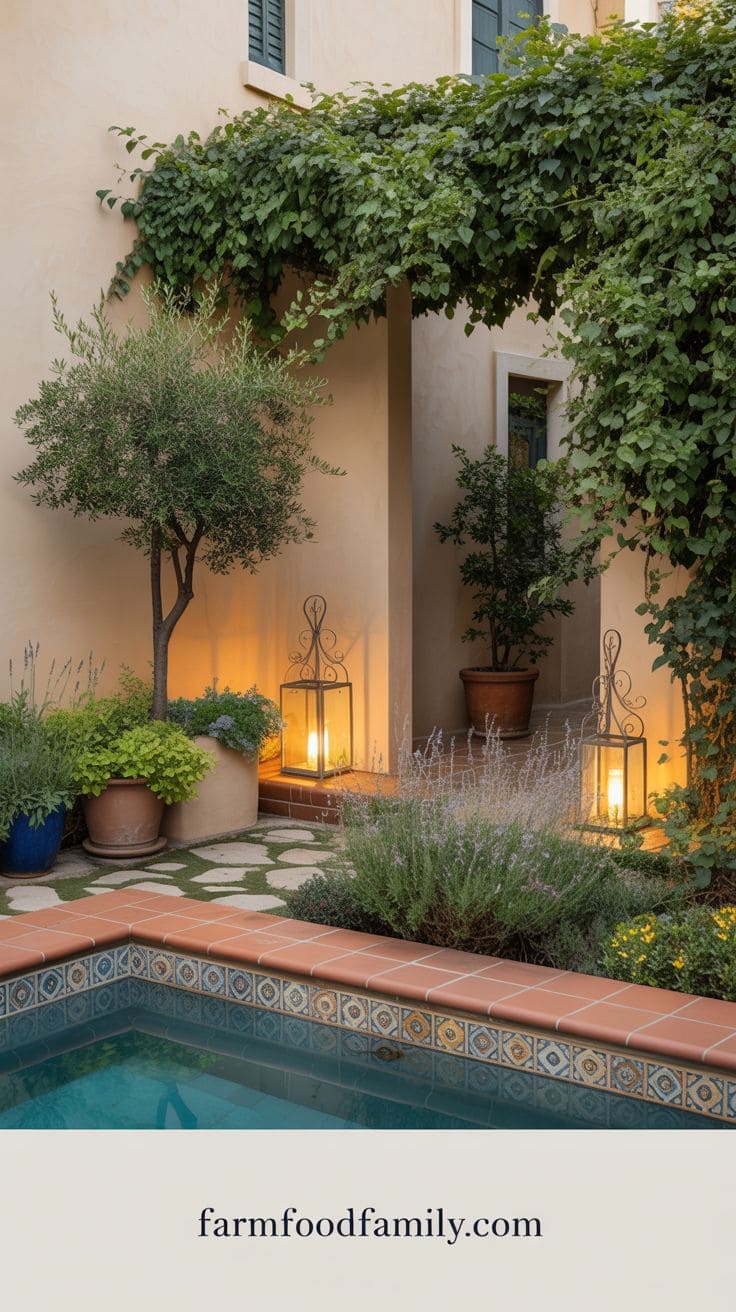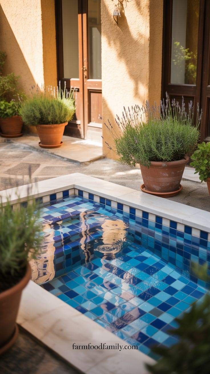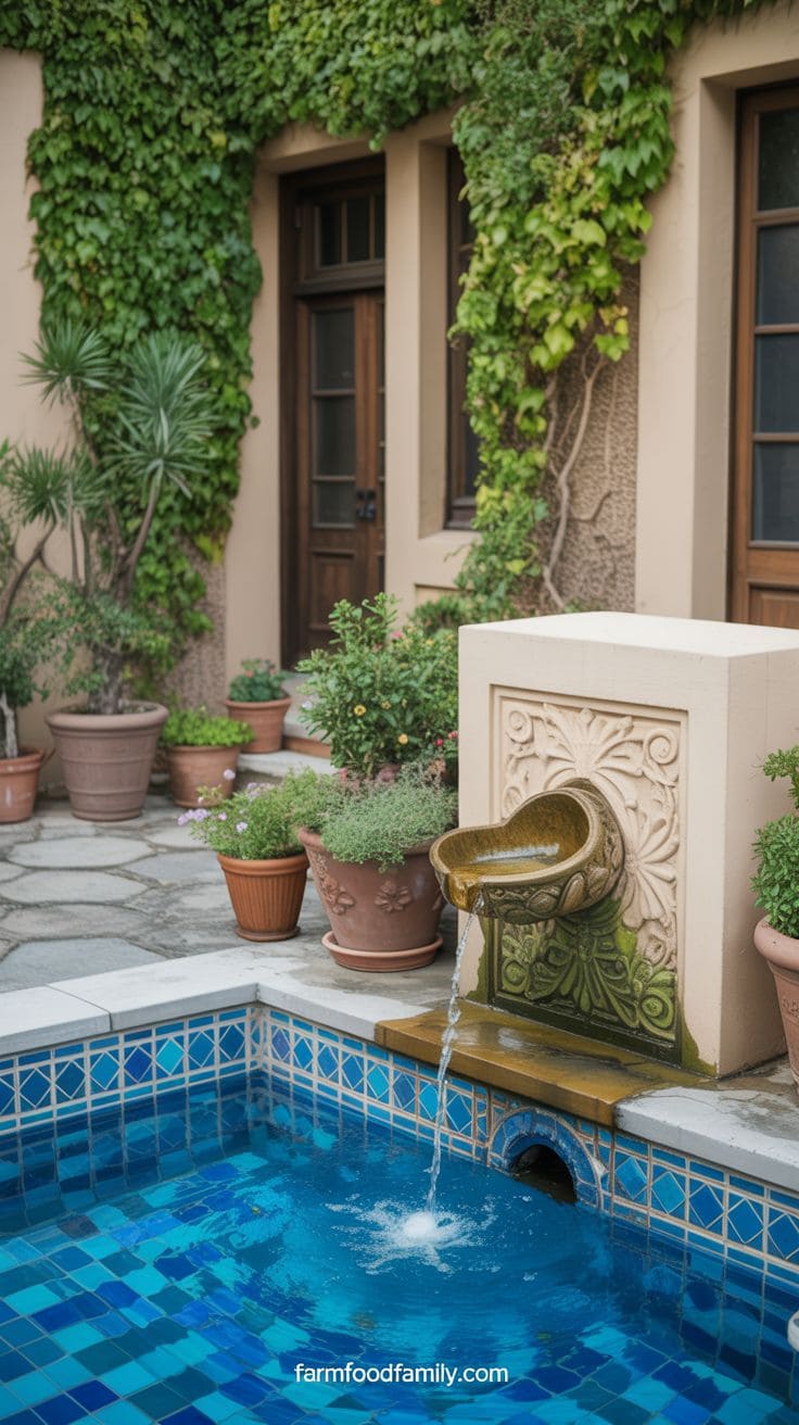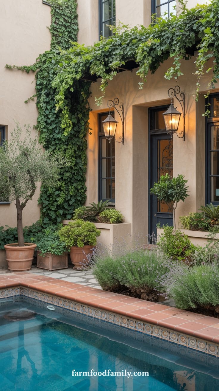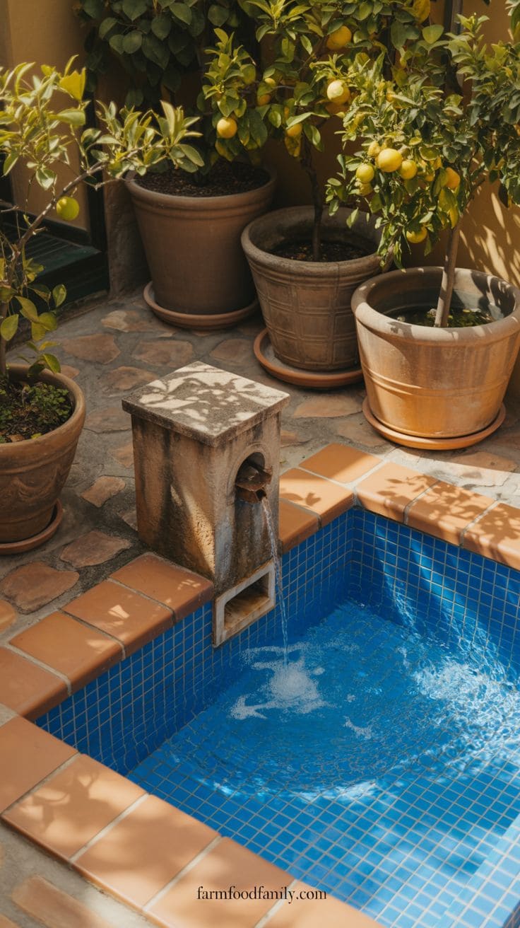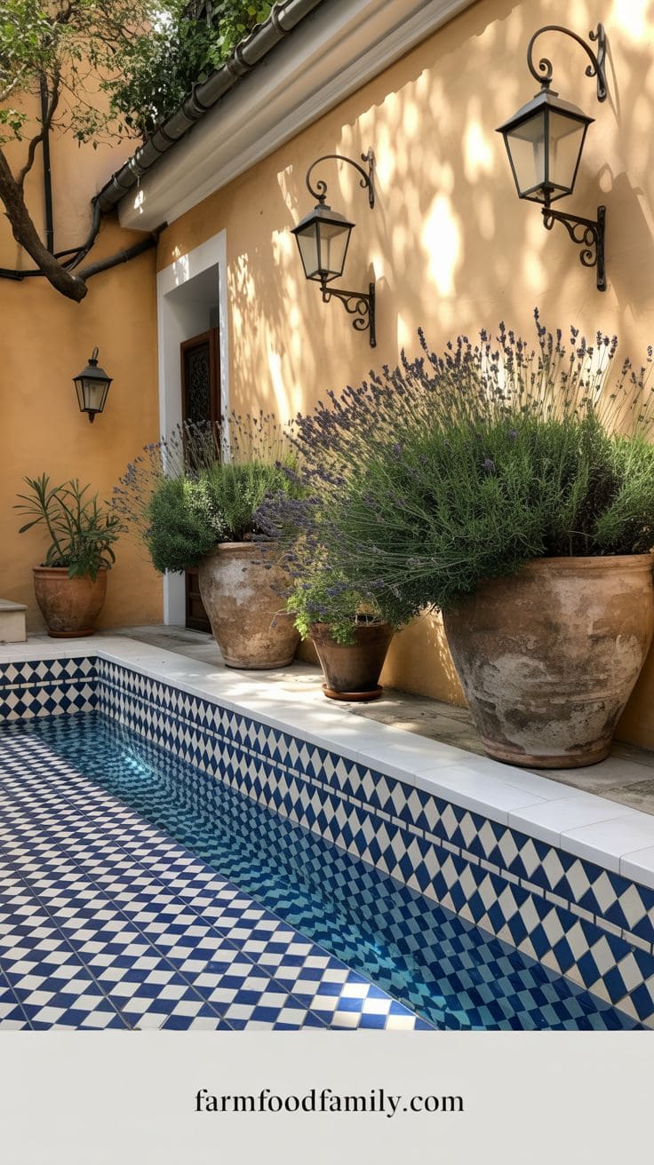 Small fountains or spouts carved into the wall above the pool can provide a calming sound of water, while enormous terracotta pots filled with lavender or citrus plants provide scent and color.