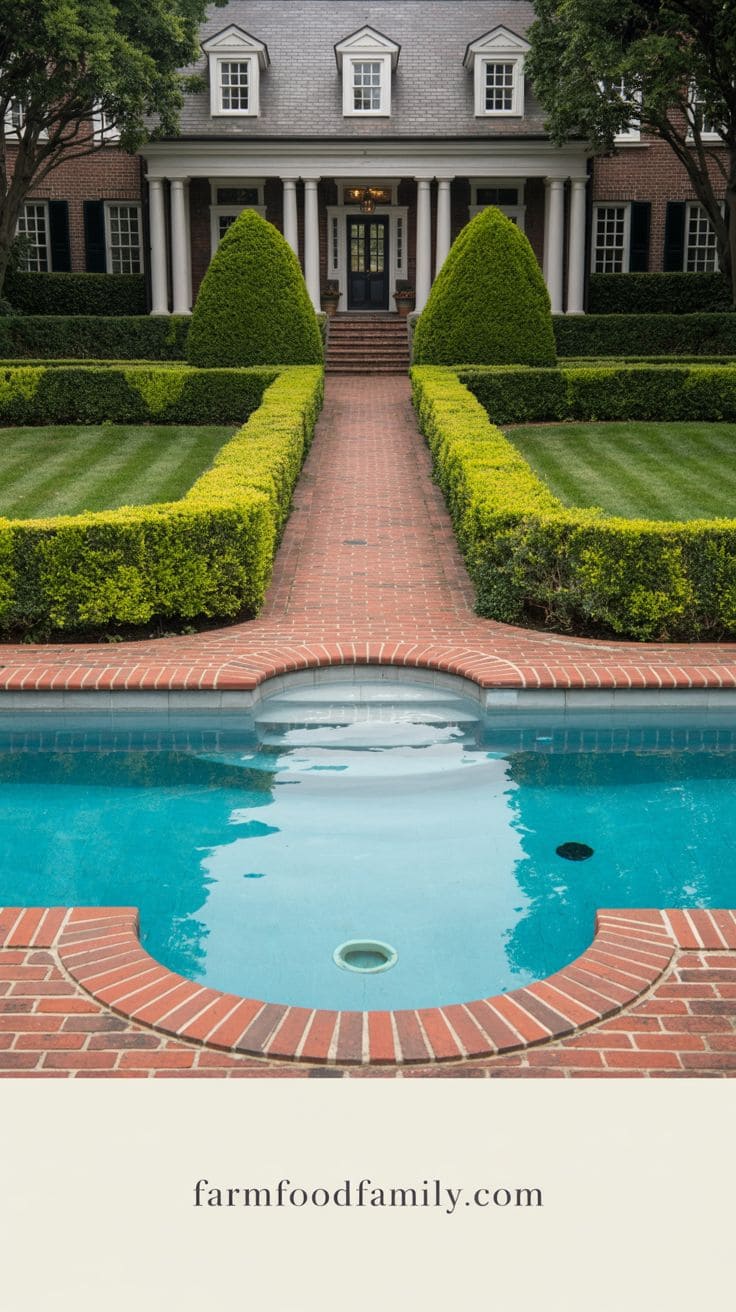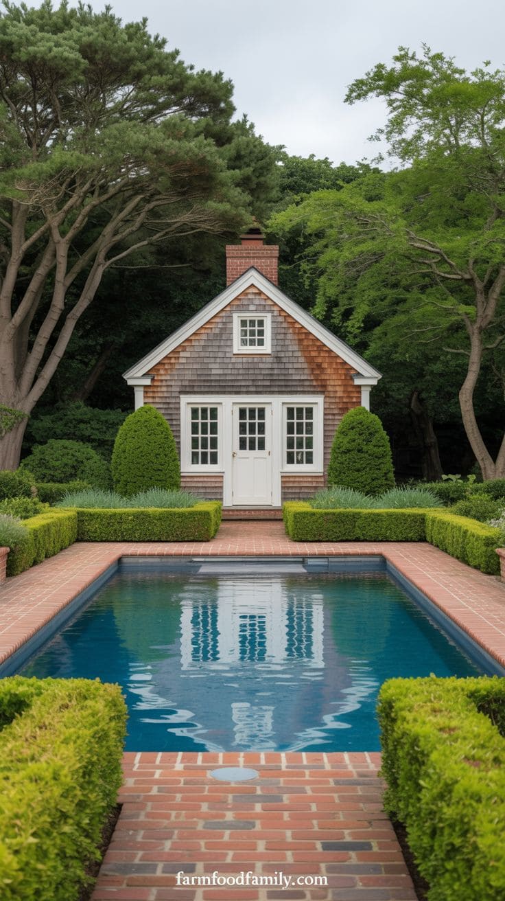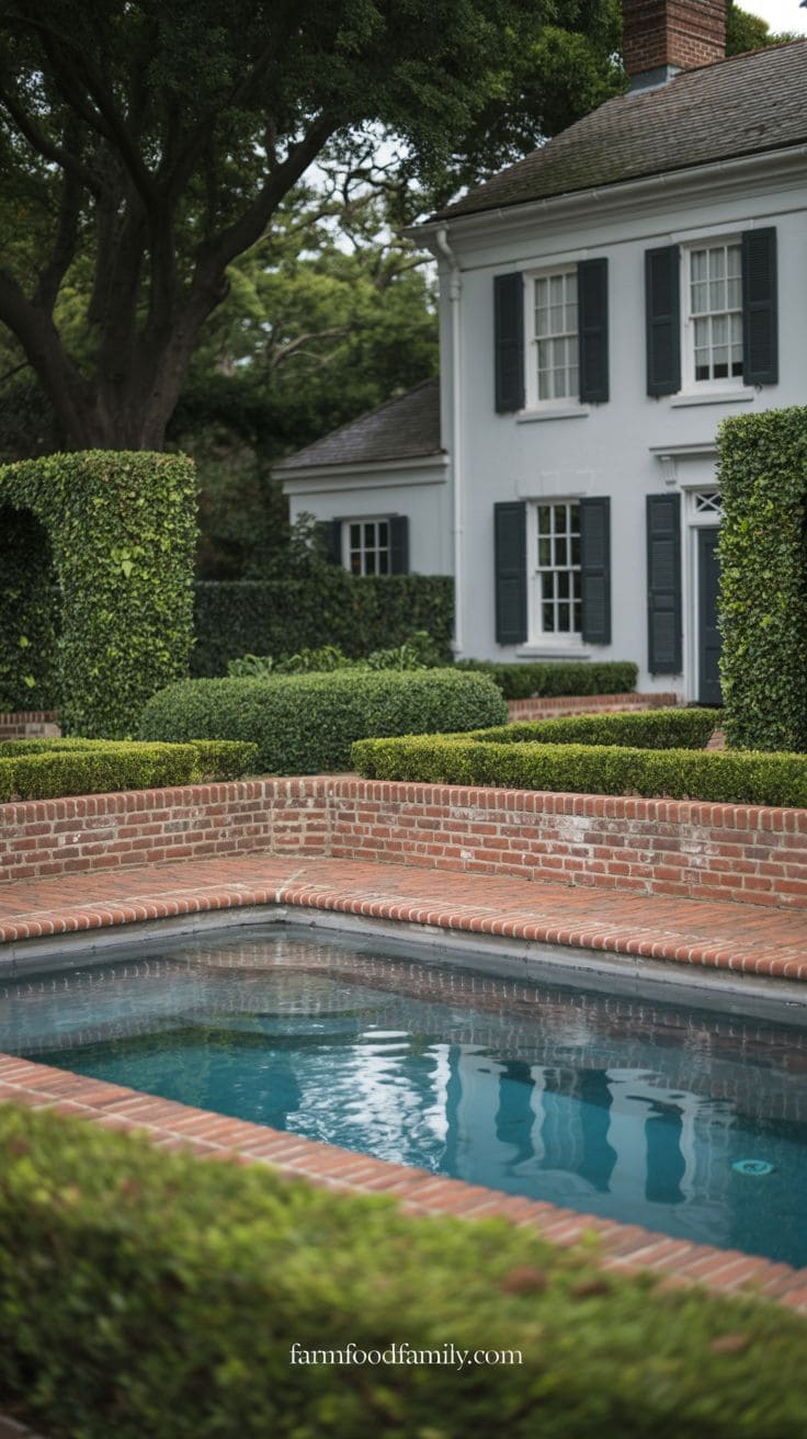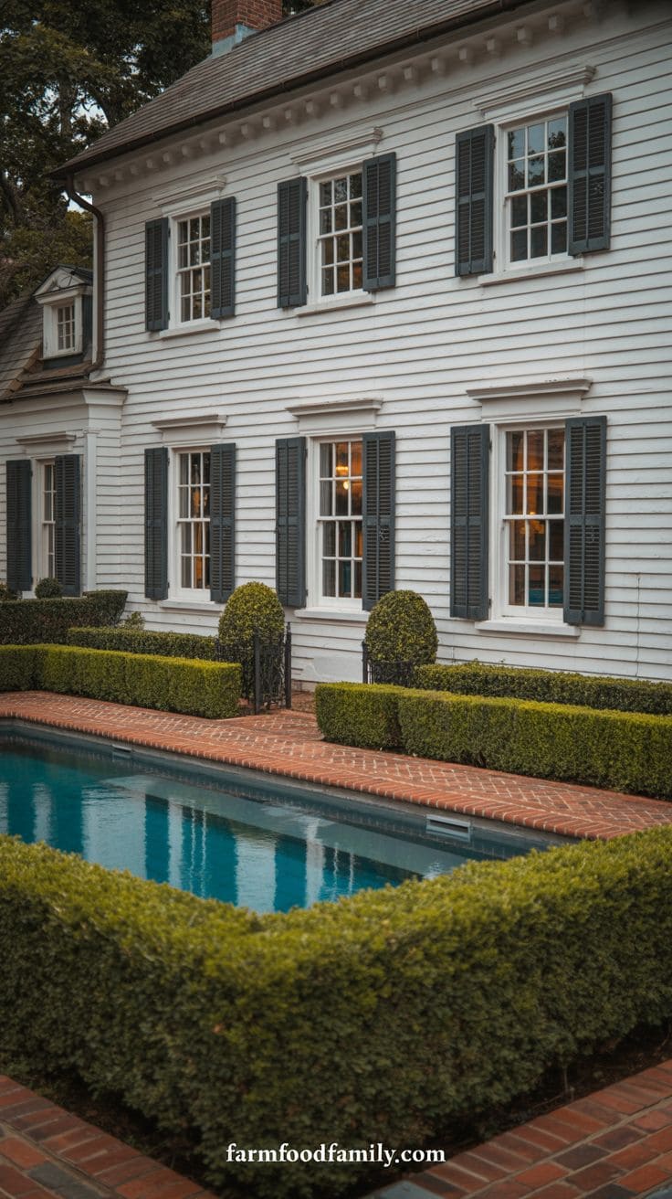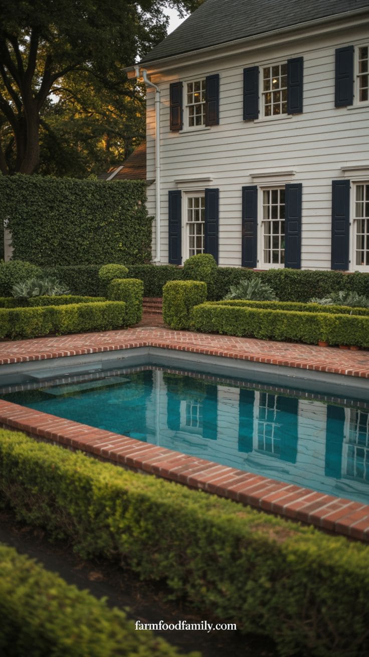 For a classic colonial look, surround the pool with black shutters, white trim, and boxwood hedges. This combination feels grounded, welcoming, and timeless.