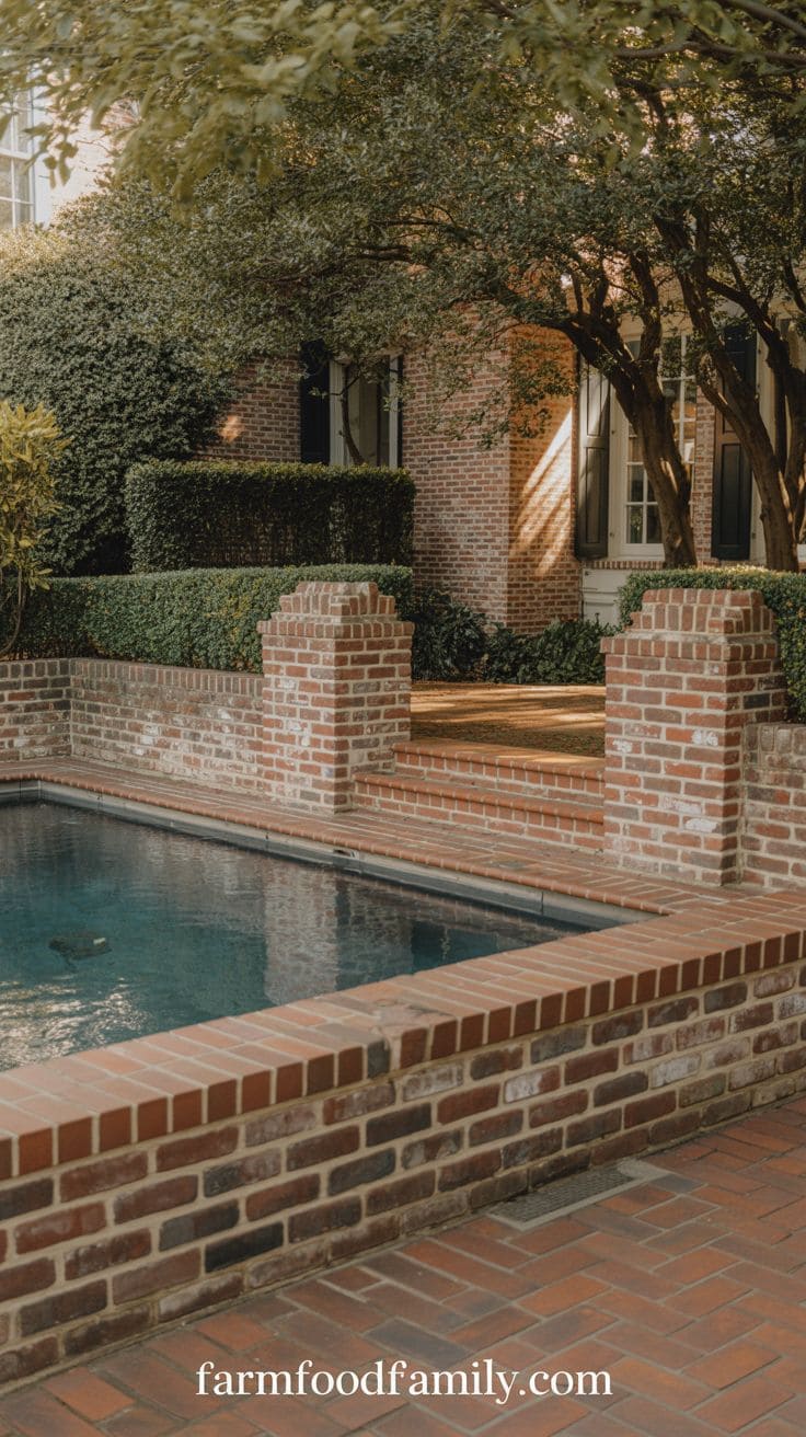 Surround the pool with old red brick coping and incorporate it into the hardscaping, such as garden walls, walkways, or even a modest brick courtyard enclosure.