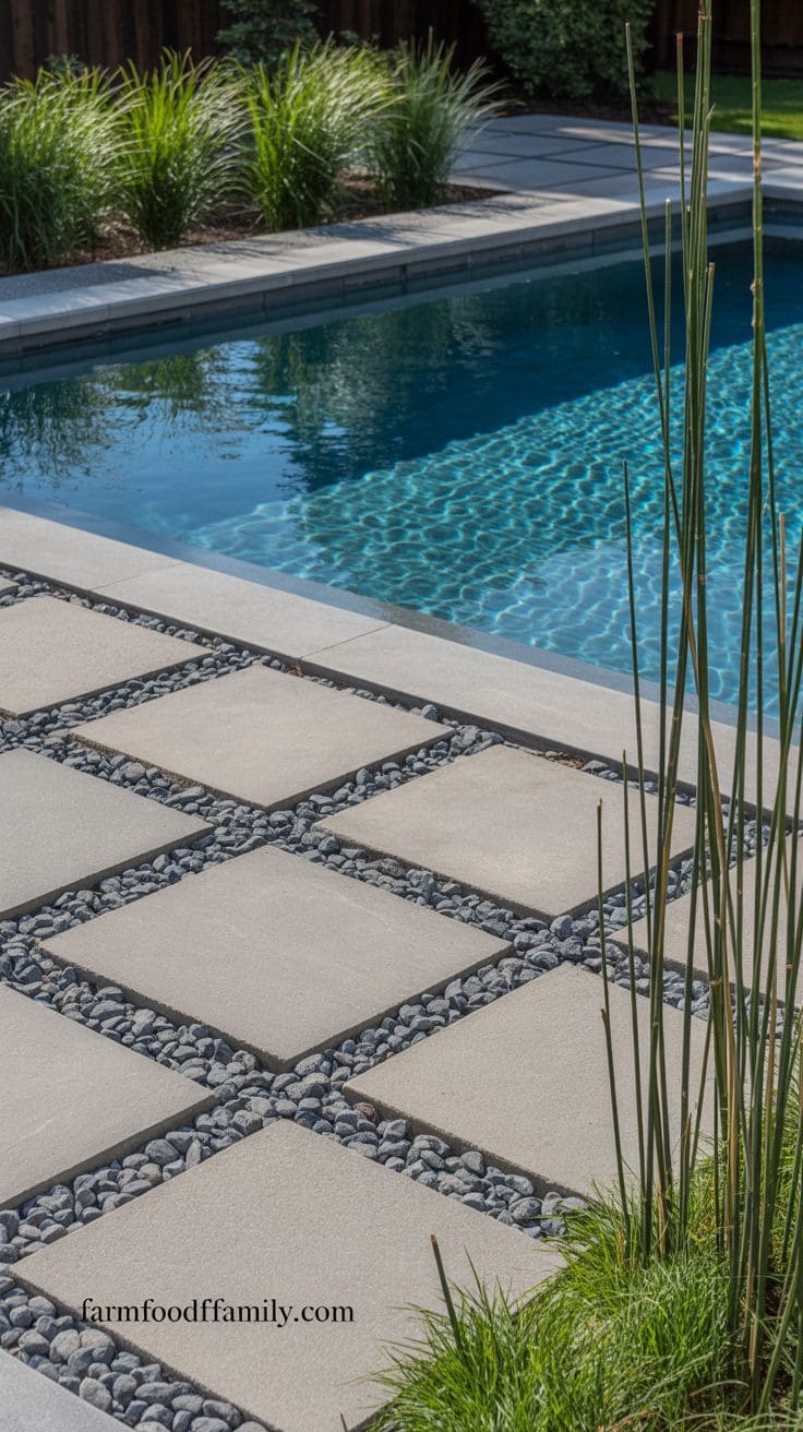 Concrete pavers interspersed with grass or gravel around the perimeter create a modern and breathable hardscape.