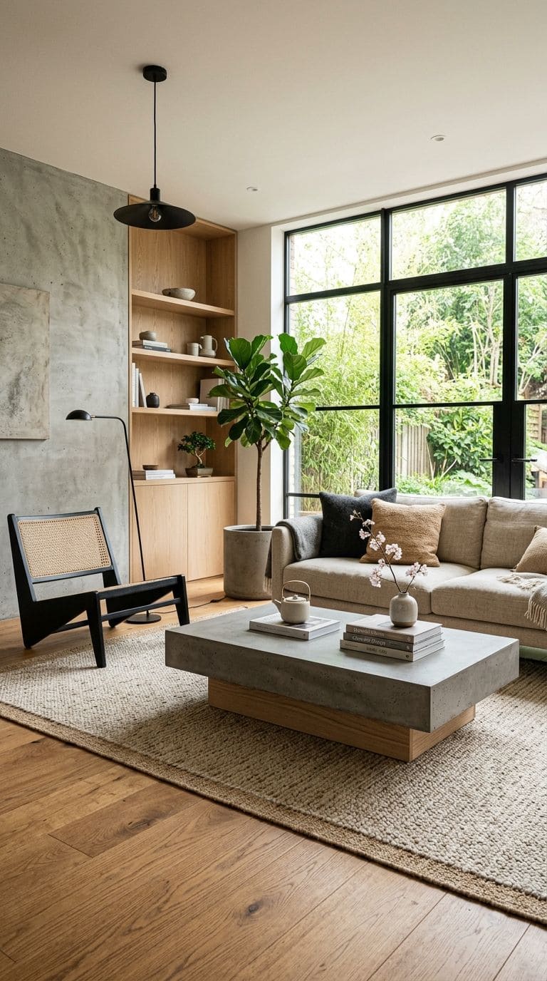 Add modern touches with concrete accents. Whether it’s a table or a wall finish, the cool tones of concrete pair well with the warm woods typical in Japandi interiors.
