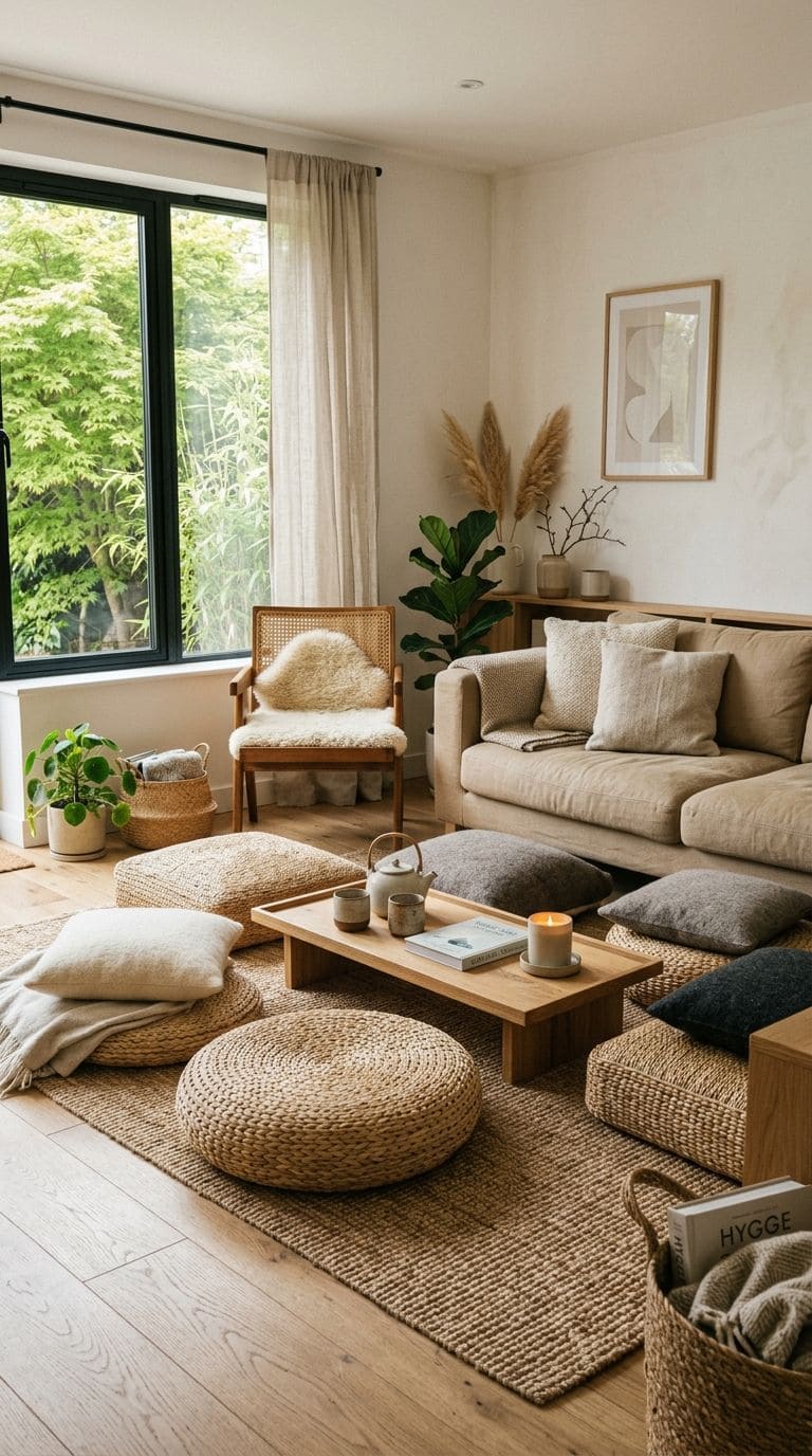 Add floor cushions for extra seating that’s easy to stow away. They’re perfect for casual gatherings.