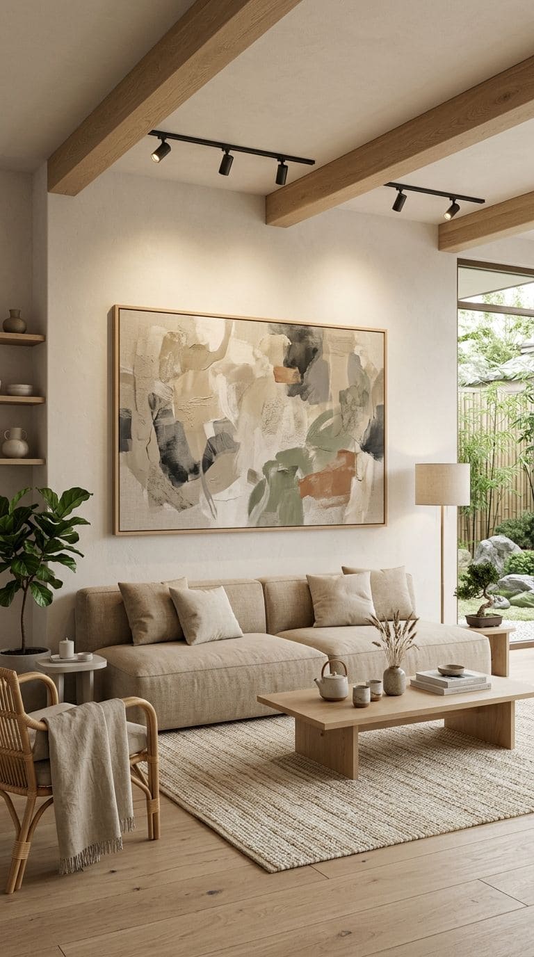 Decorate with neutral, abstract artwork that complements the Japandi aesthetic in soft, muted colors.