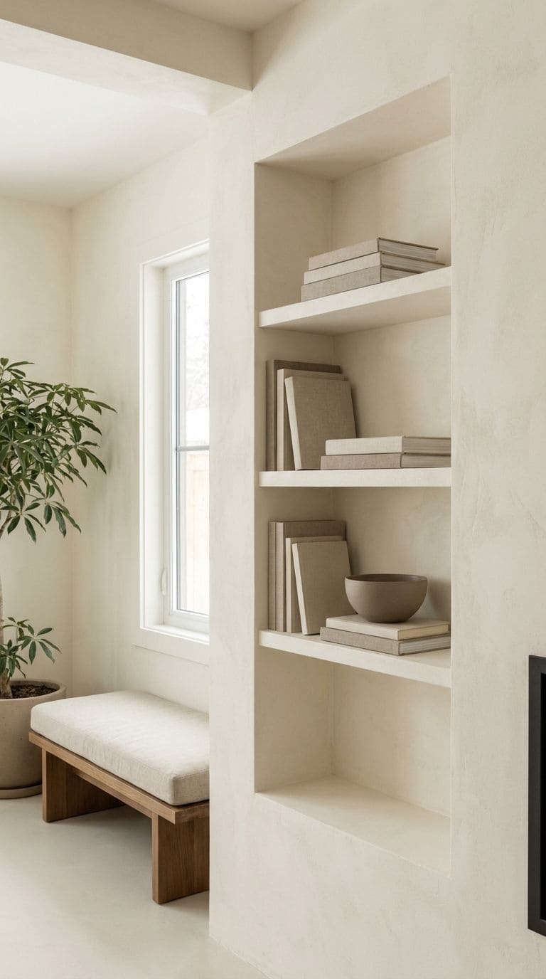 Select minimalist bookshelves that blend into the walls and are sparingly filled.