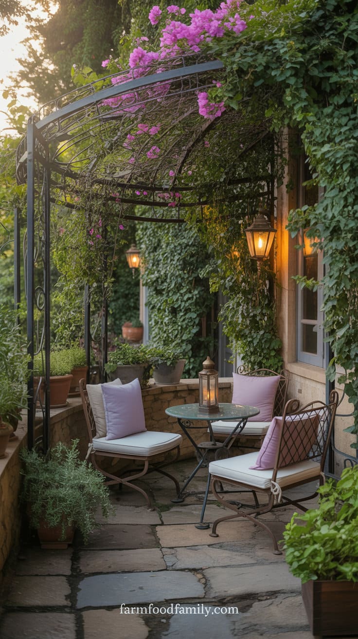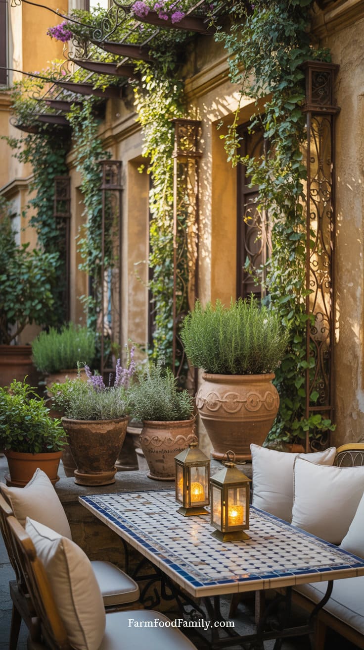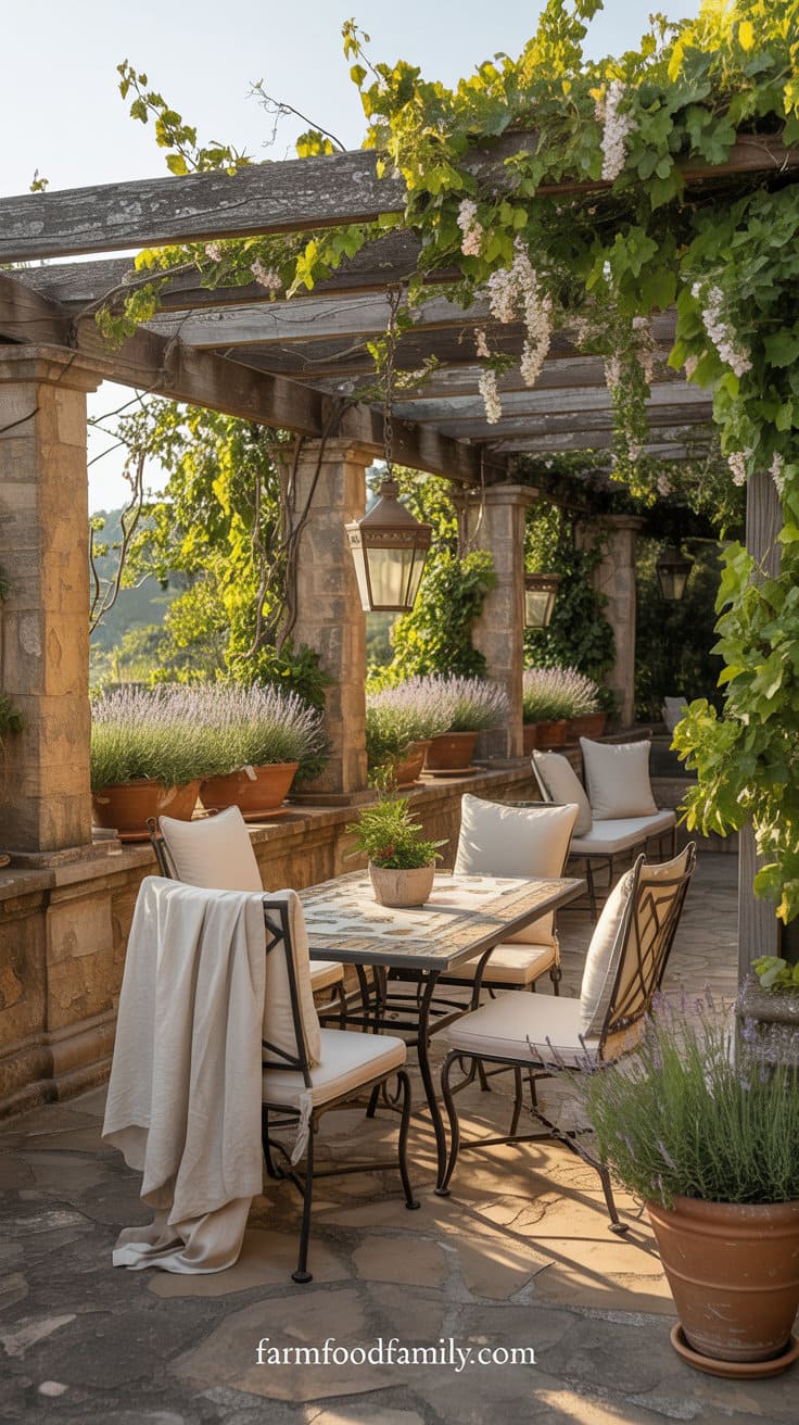 Below the pergola, there is bistro-style seating with mosaic-topped tables, aged iron lanterns, and pale-colored linen cushions.